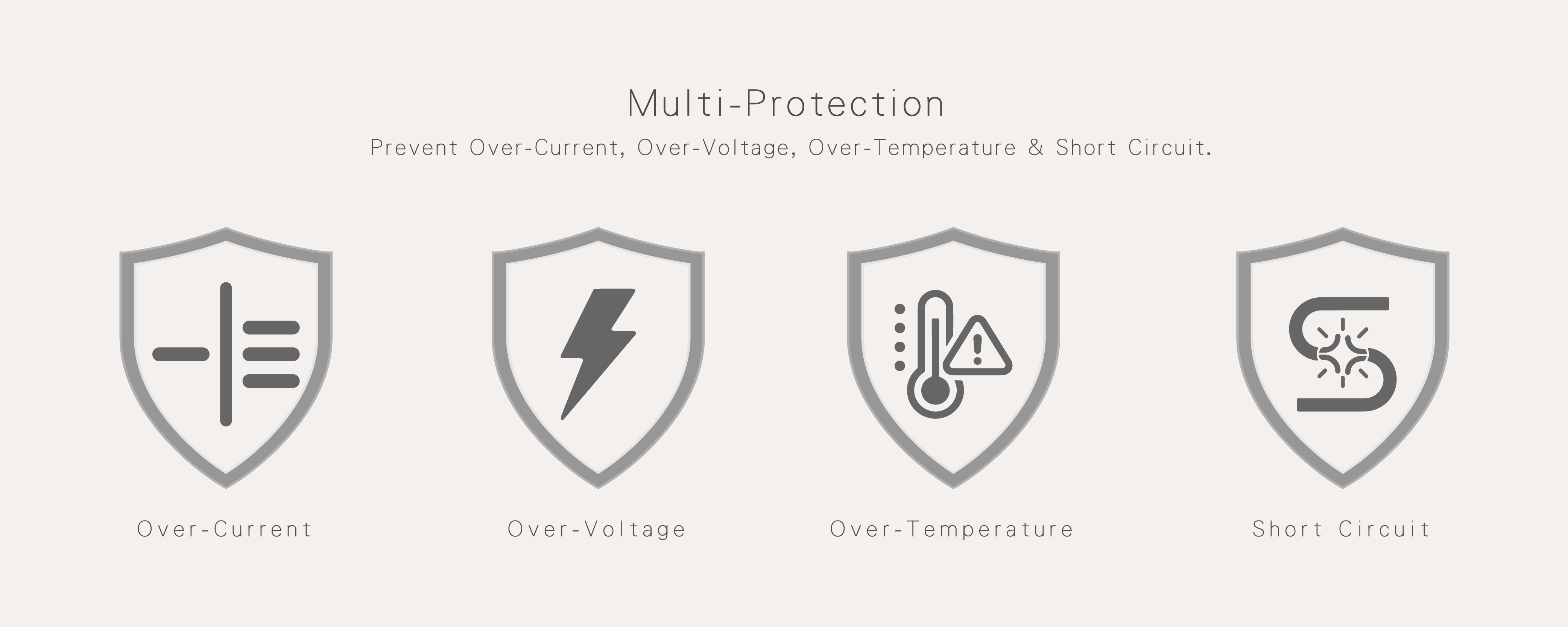 - Multiple safety protection, prevent Over-Current, Over-Voltage, Over-Temperature and Short Circuit.