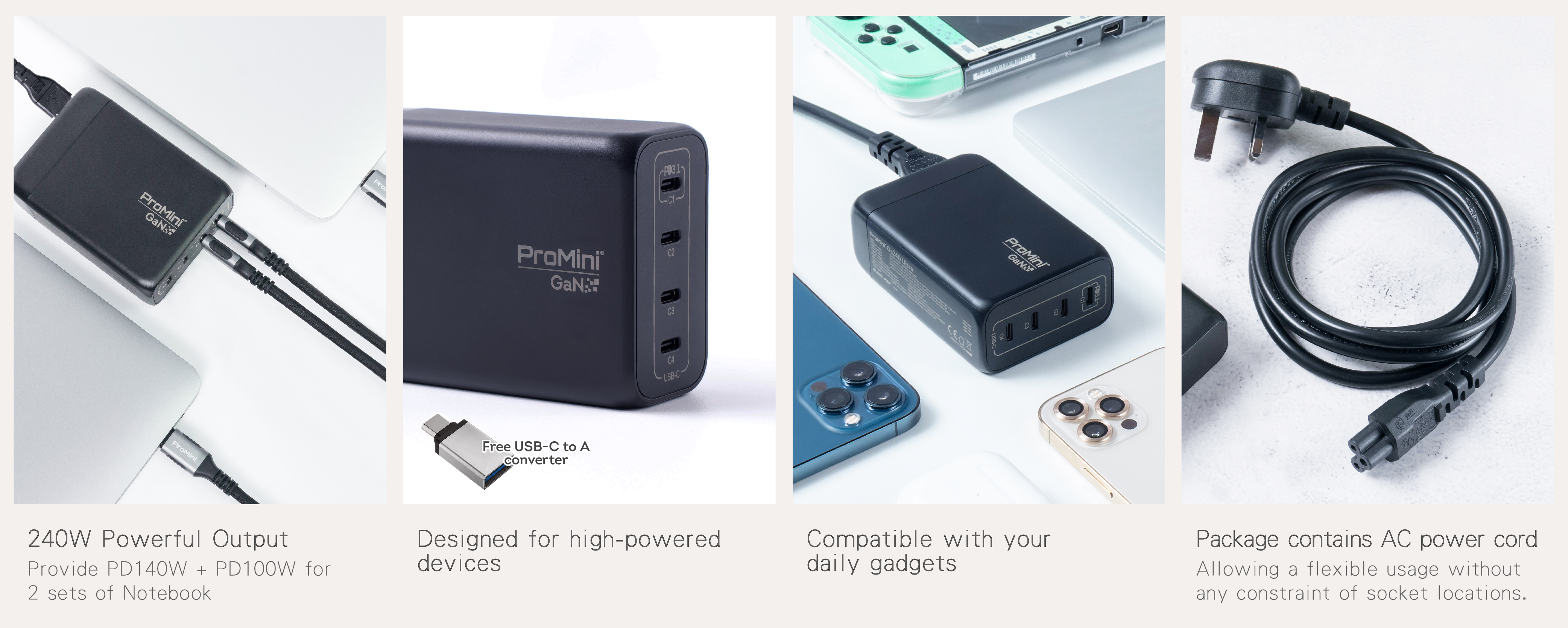 - Charges 4 devices simultaneously, USB-C1 port keeps PD140W output