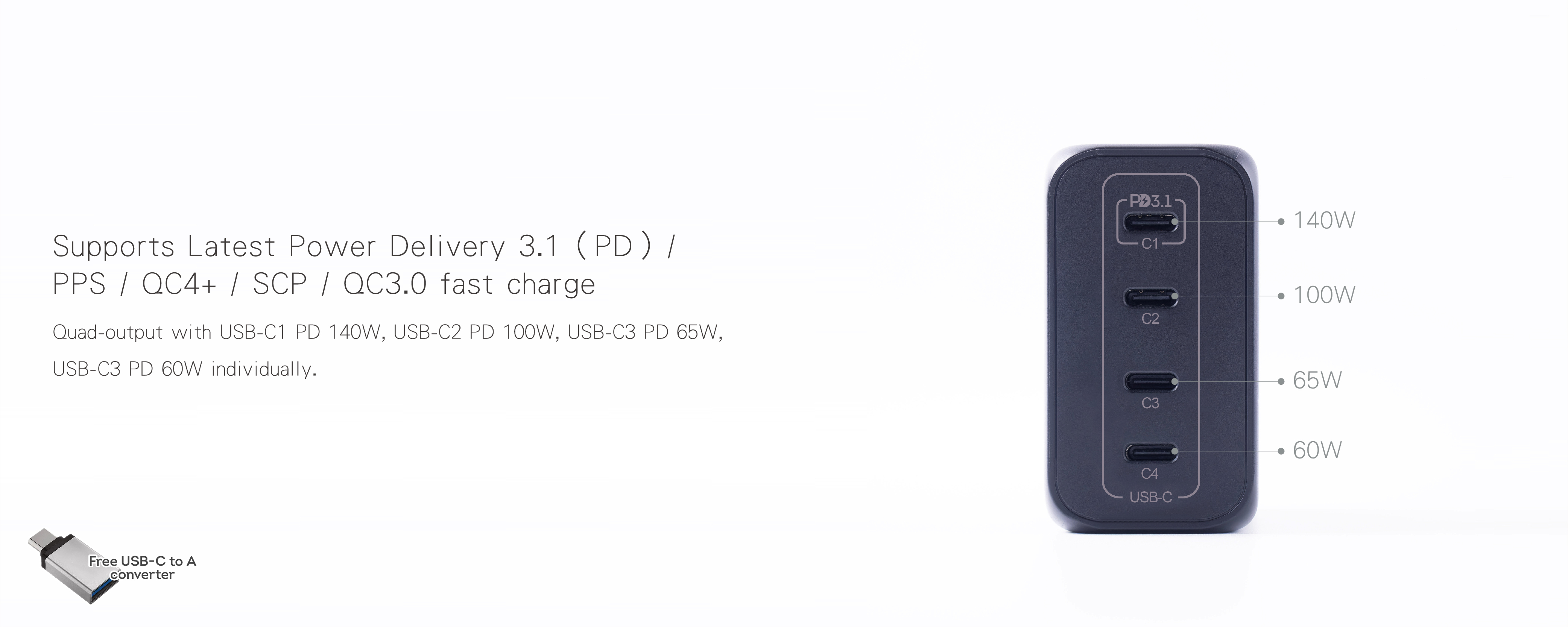 - Quad USB-C output- C1-PD140W, C2-PD100W, C3-PD65W, C4-60W individually. ( Free USB-C to USB-A converter )