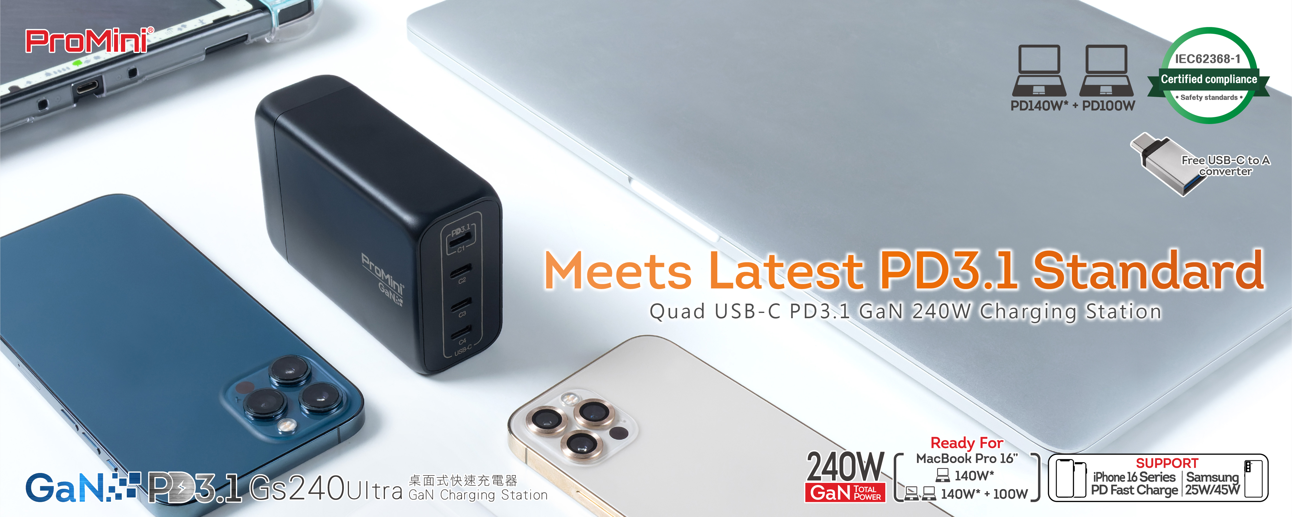 - Quad USB-C PD3.1 GaN 240W Charging Station.