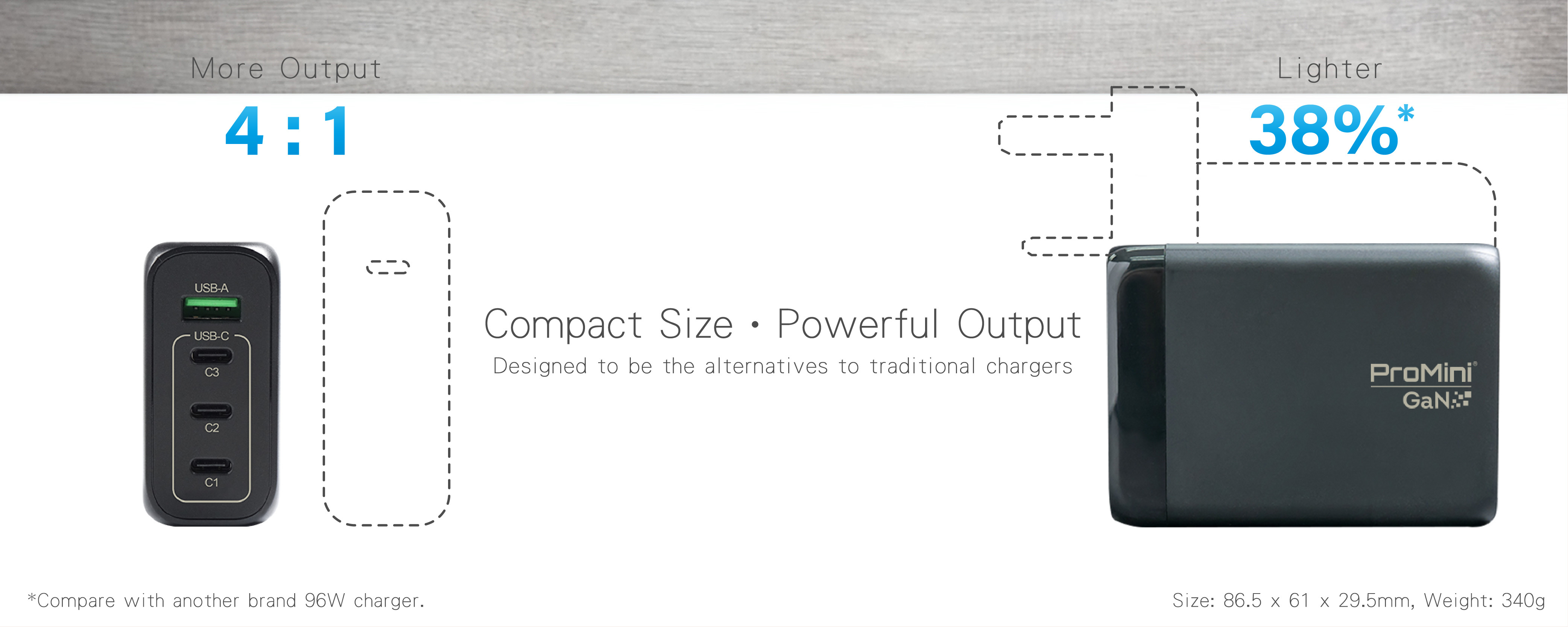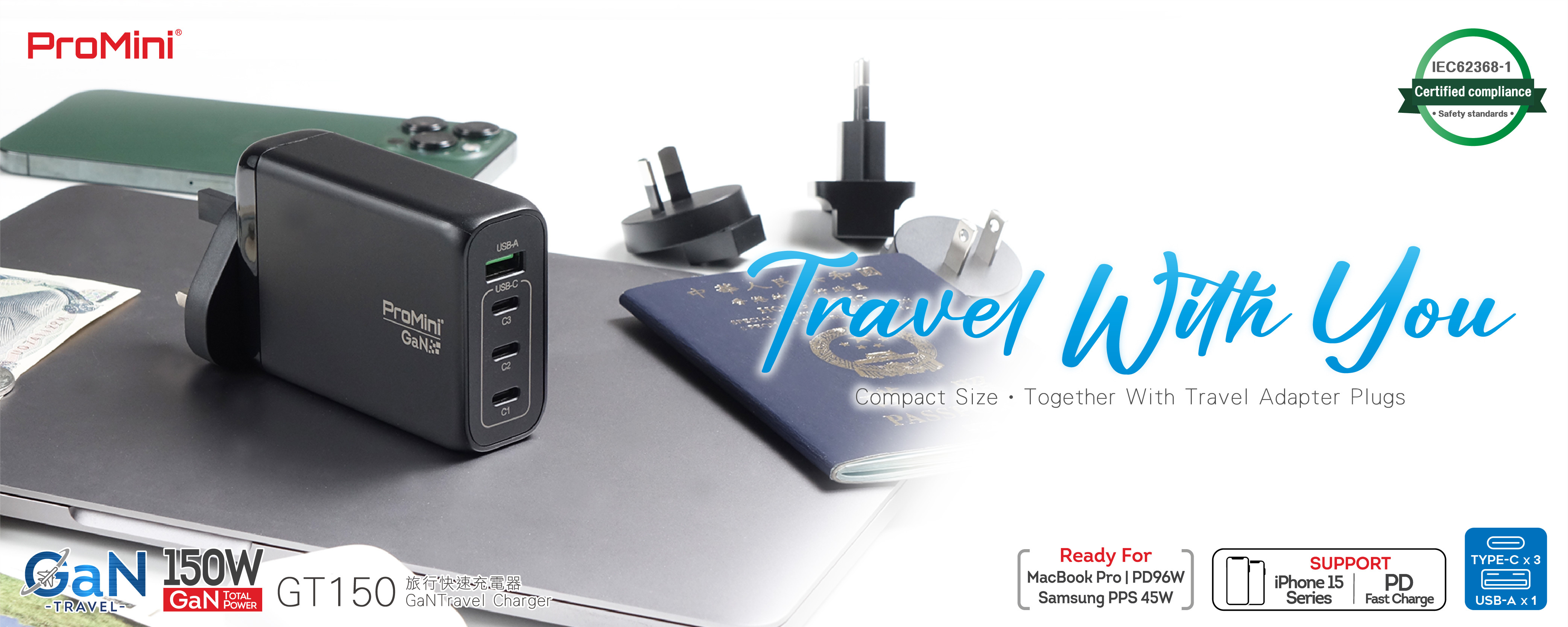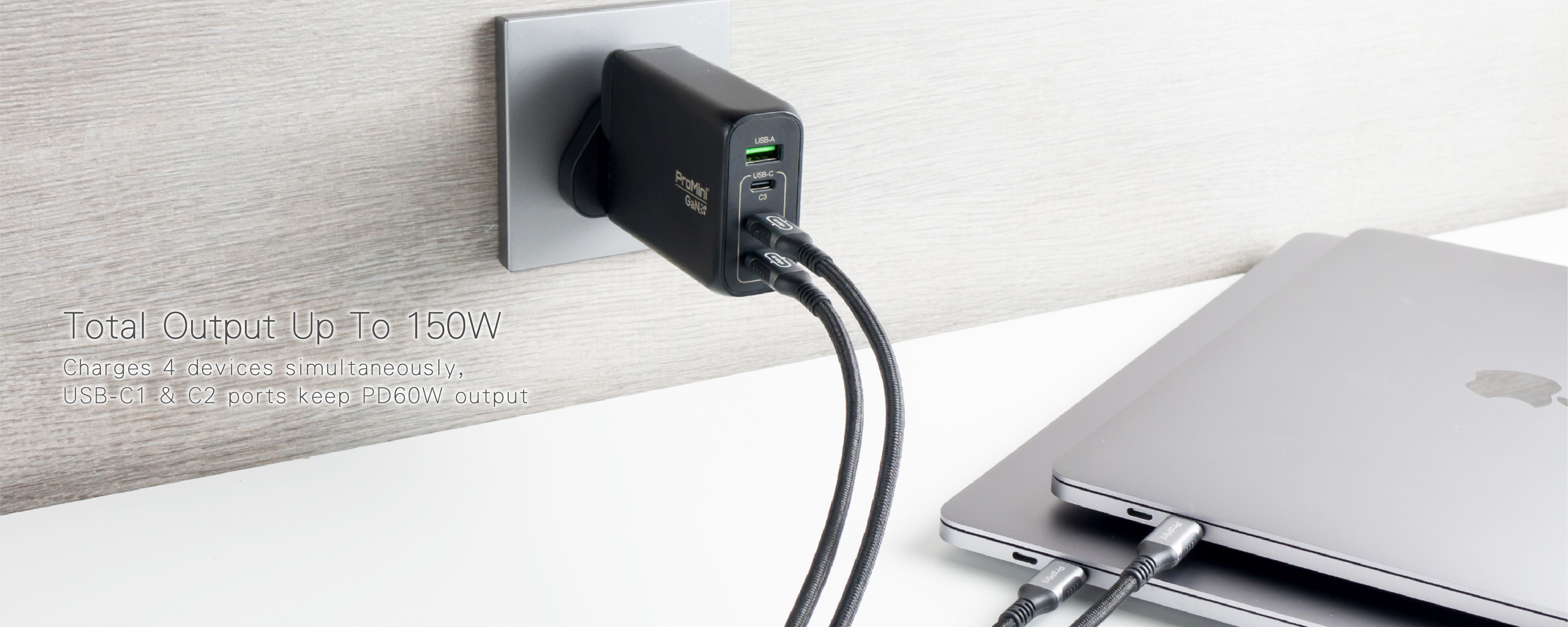 - With the advanced GaN technology, ProMini GT150 is designed to be the alternatives to traditional chargers, by performing powerful output for multiple devices in a more compact and convenient size.