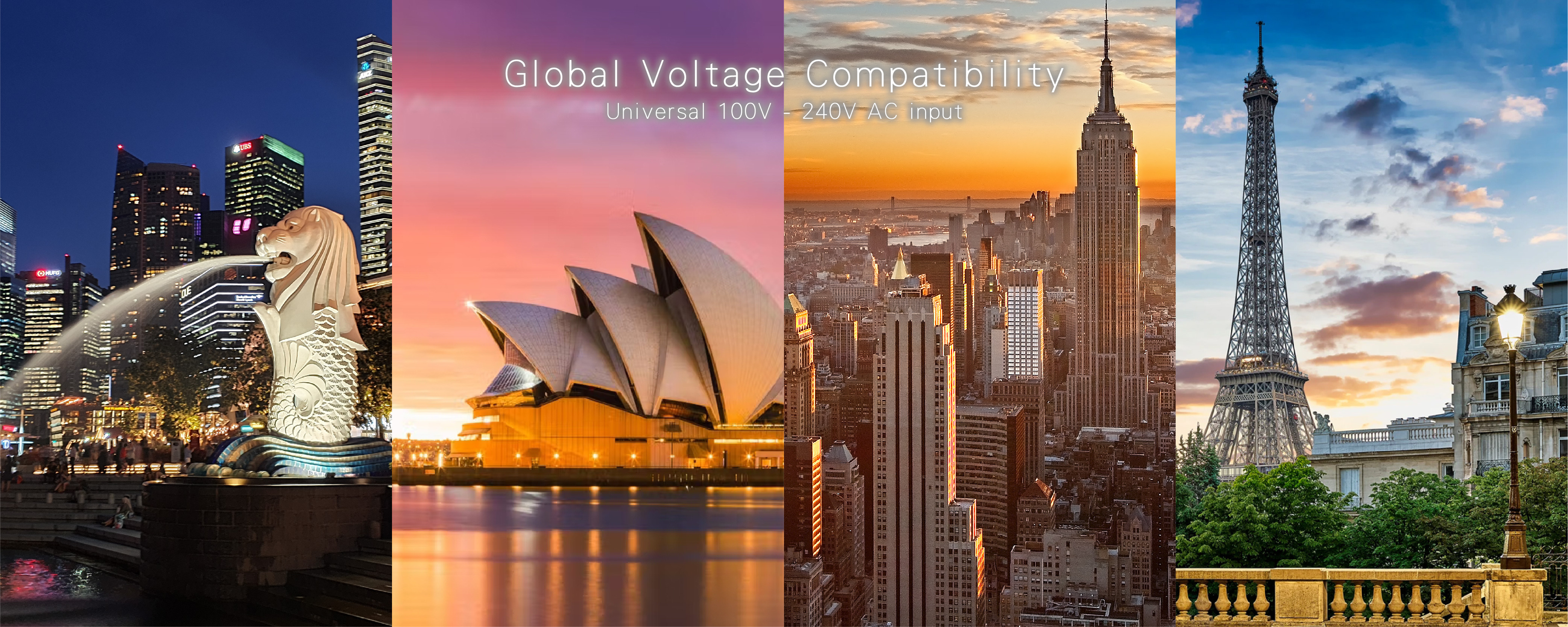 - Interchangeable AC plugs (UK, AU, EU, US)