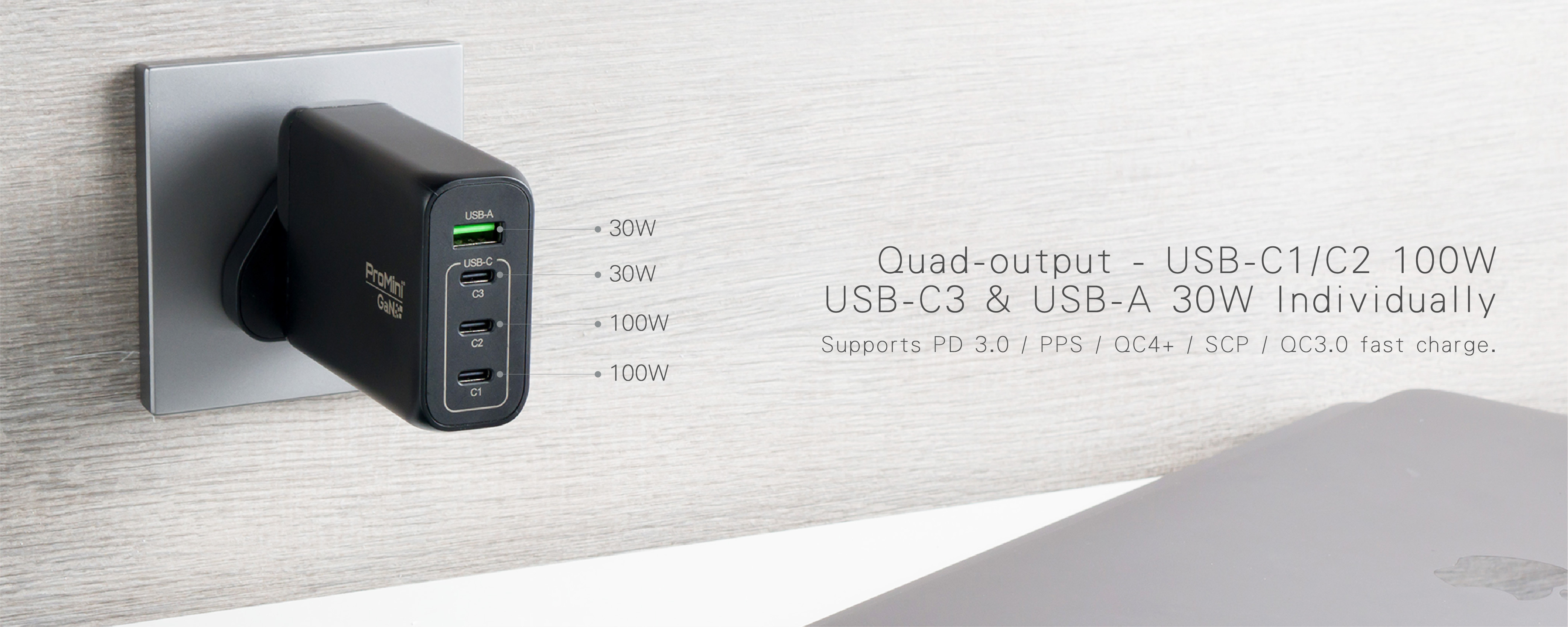 - Quad-output - USB-C1 100W, USB-C2 100W, USB-C3 30W, USB-A 30W individually.
