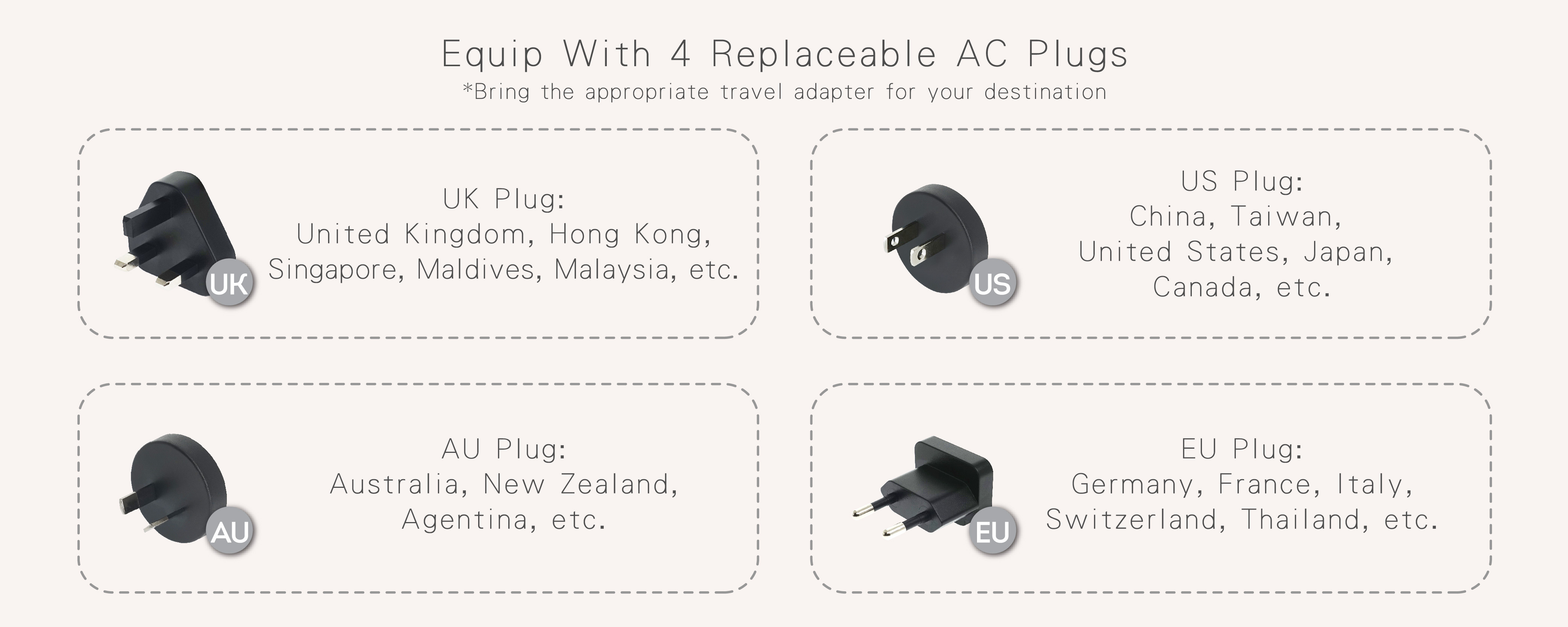 - Interchangeable AC plugs (UK, AU, EU, US)