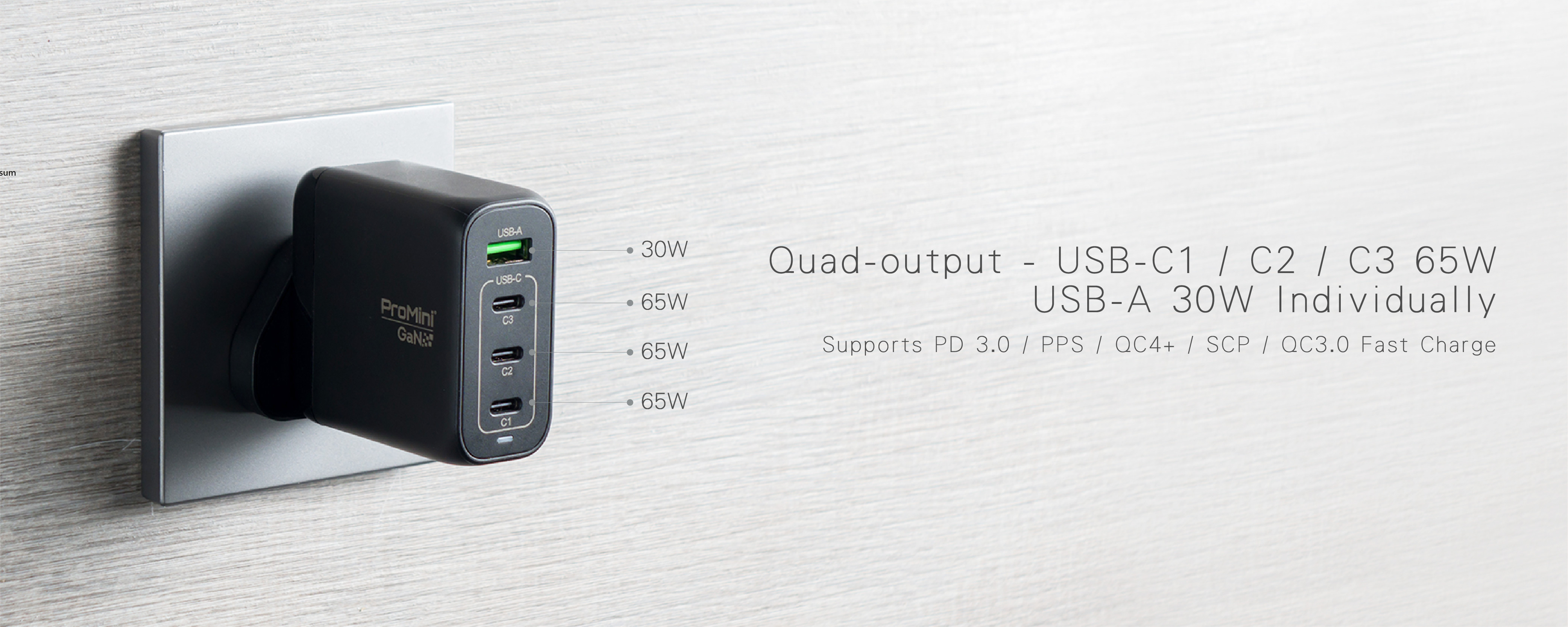 - Quad-output - USB-C1 65W, USB-C2 65W, USB-C3 30W, USB-A 30W individually.