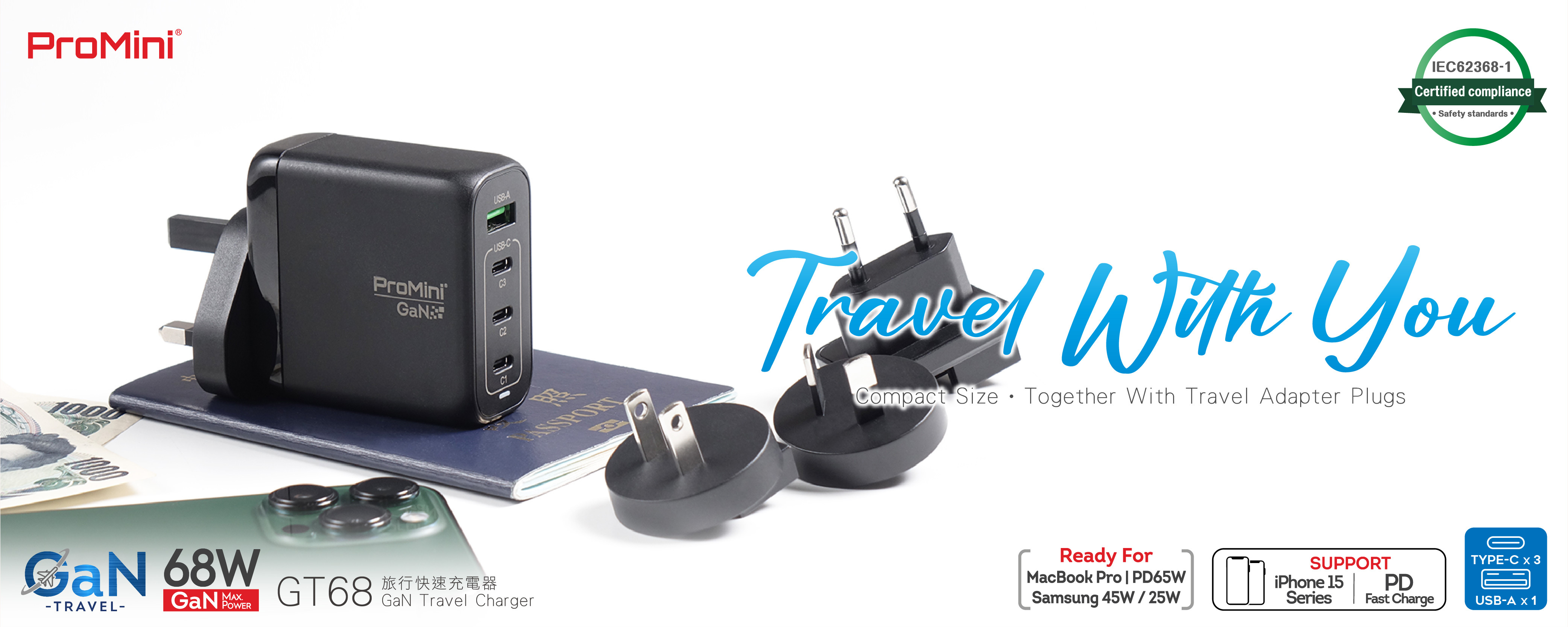 - PD3.0 GaN 68W Travel Wall Charger.
