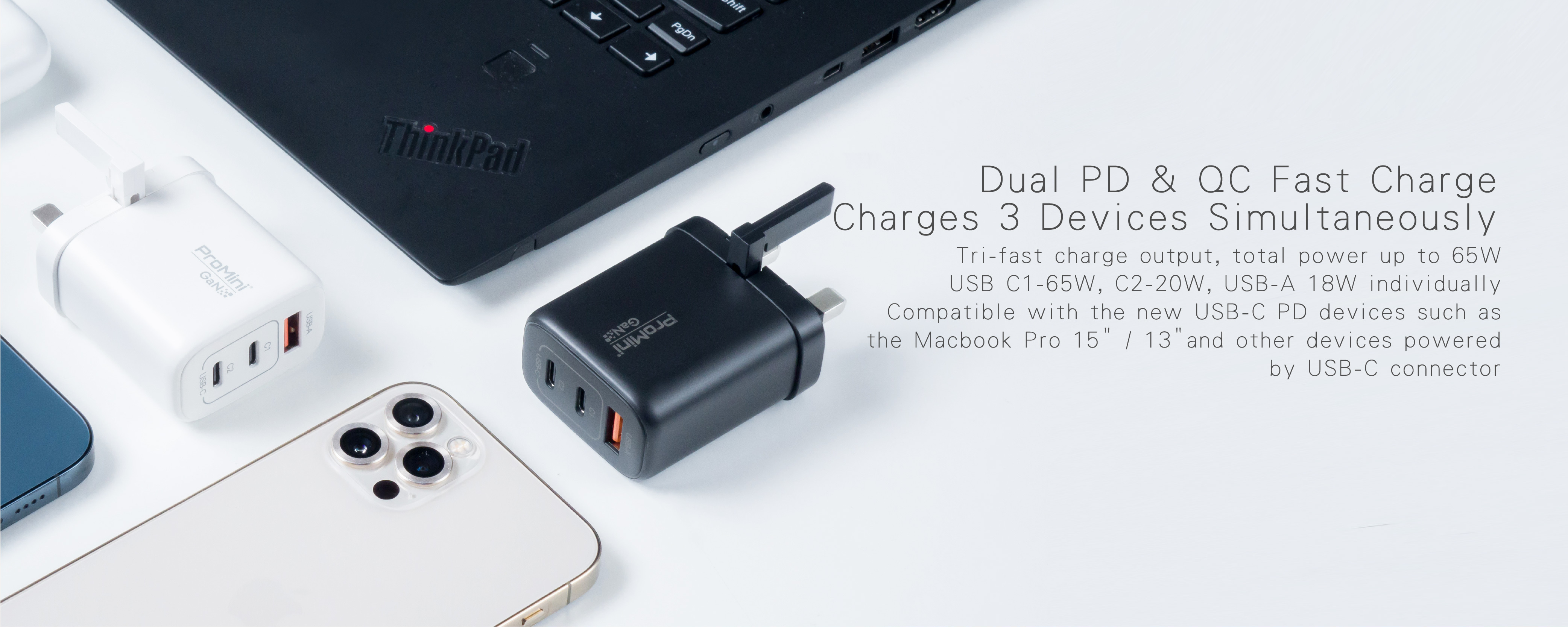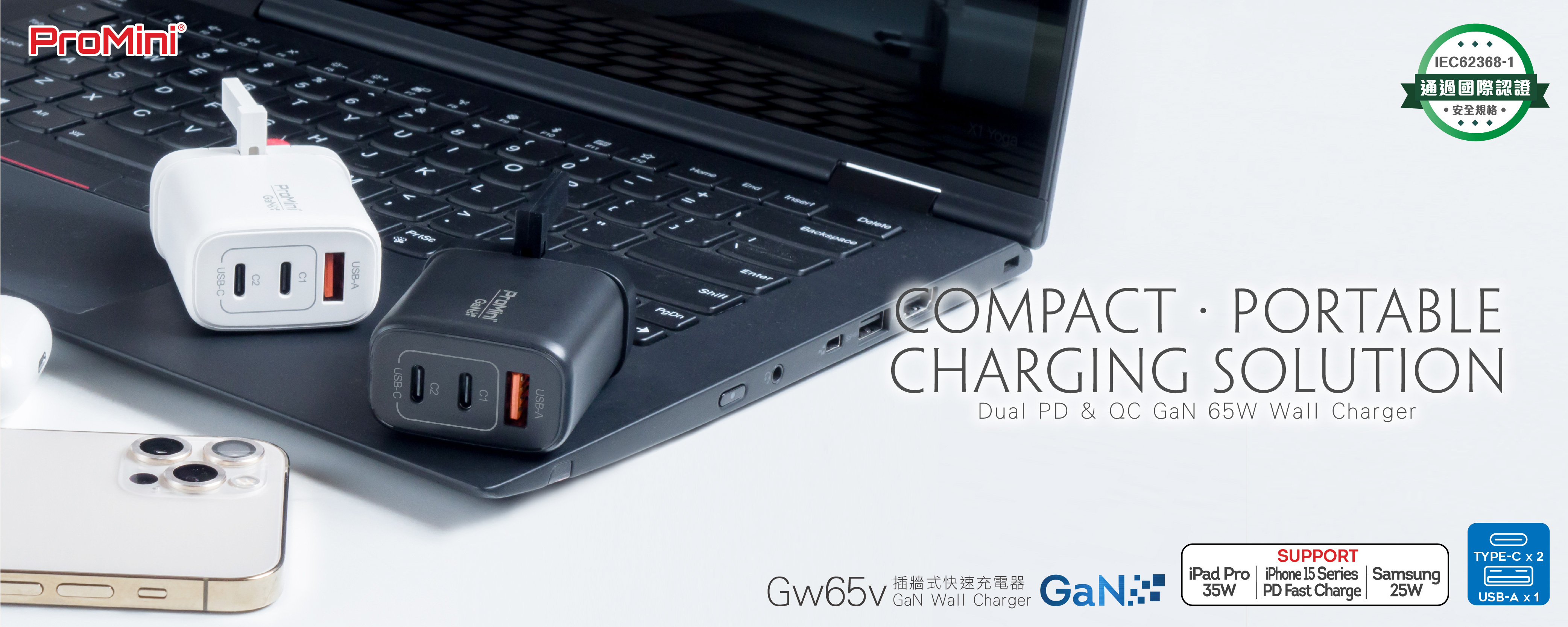 - Dual PD3.0 + QC GaN 65W Wall charger.