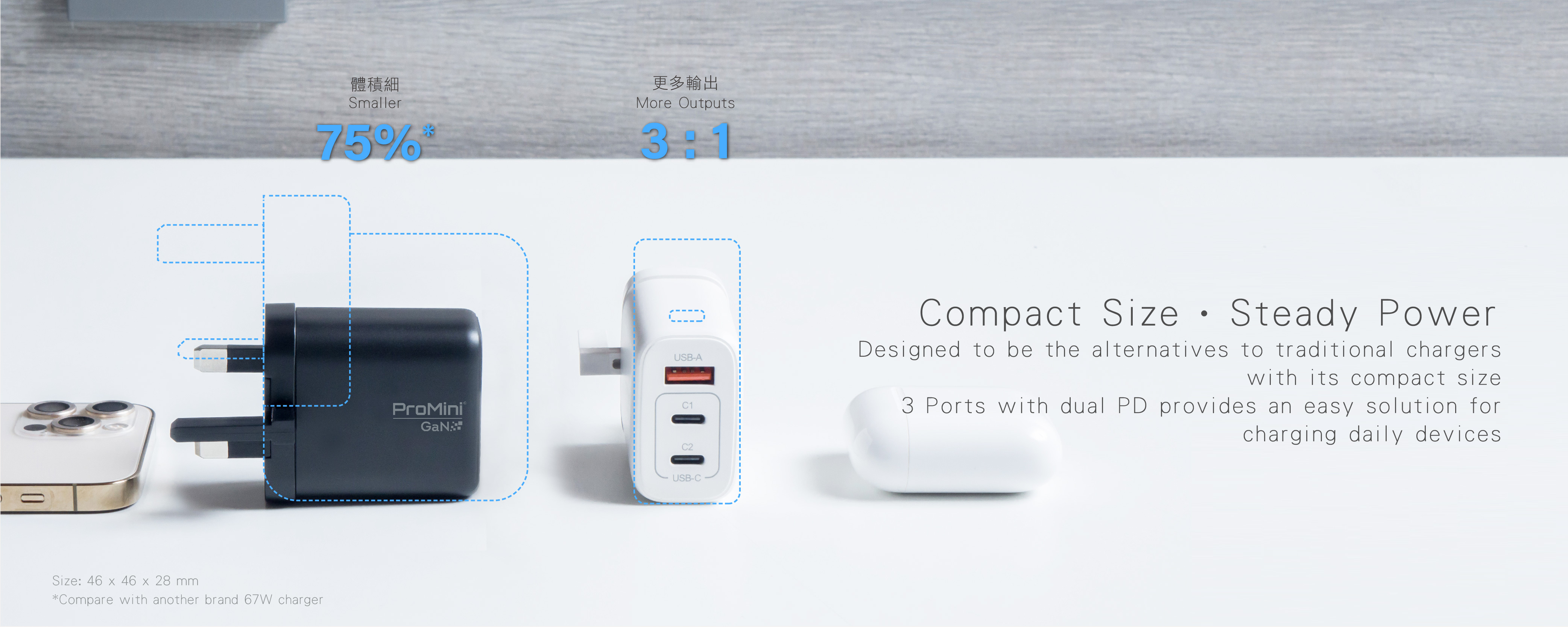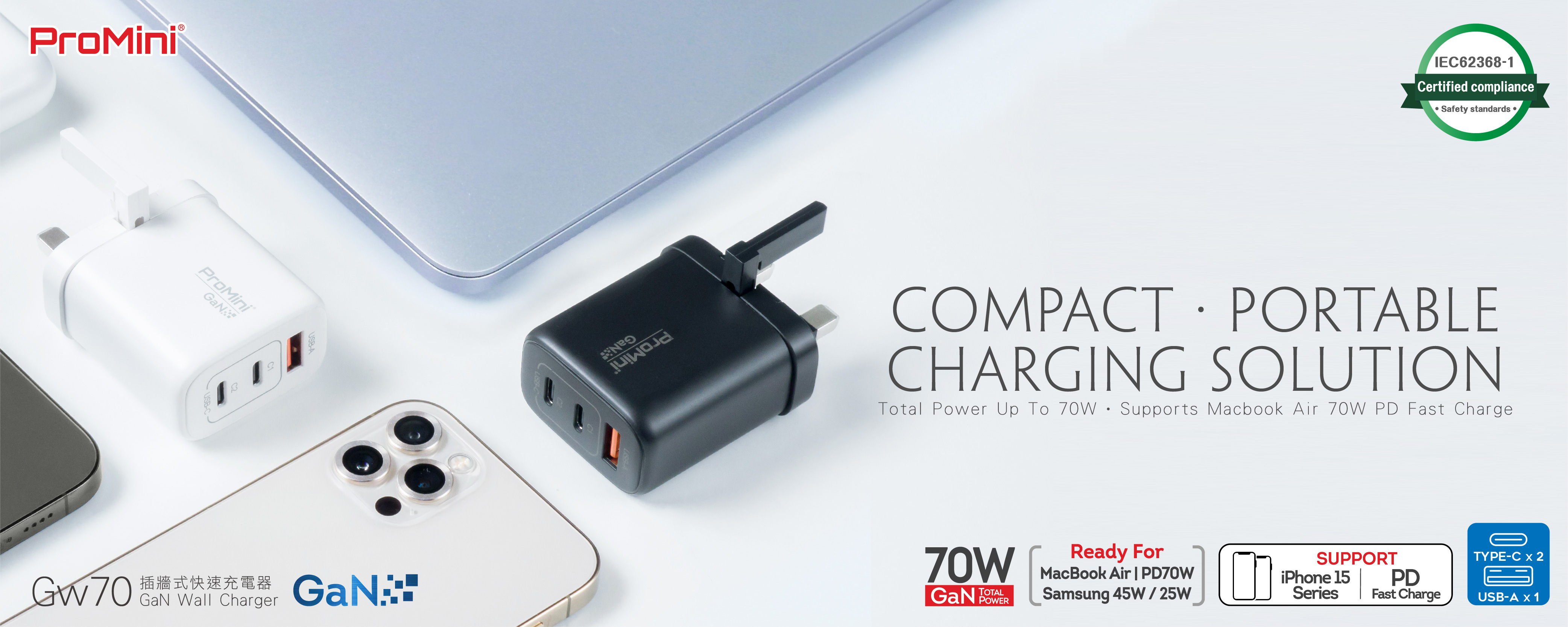 - Dual PD3.0 + QC GaN 70W Wall charger.