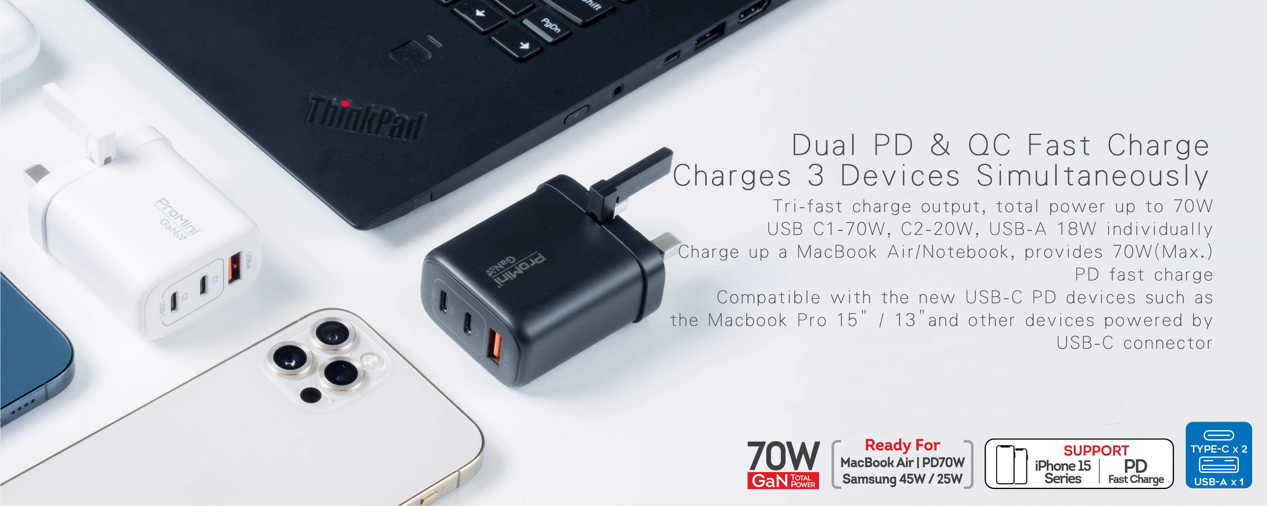 - Charge up a MacBook Air / Notebook, provides 70W (Max.) PD fast charge.