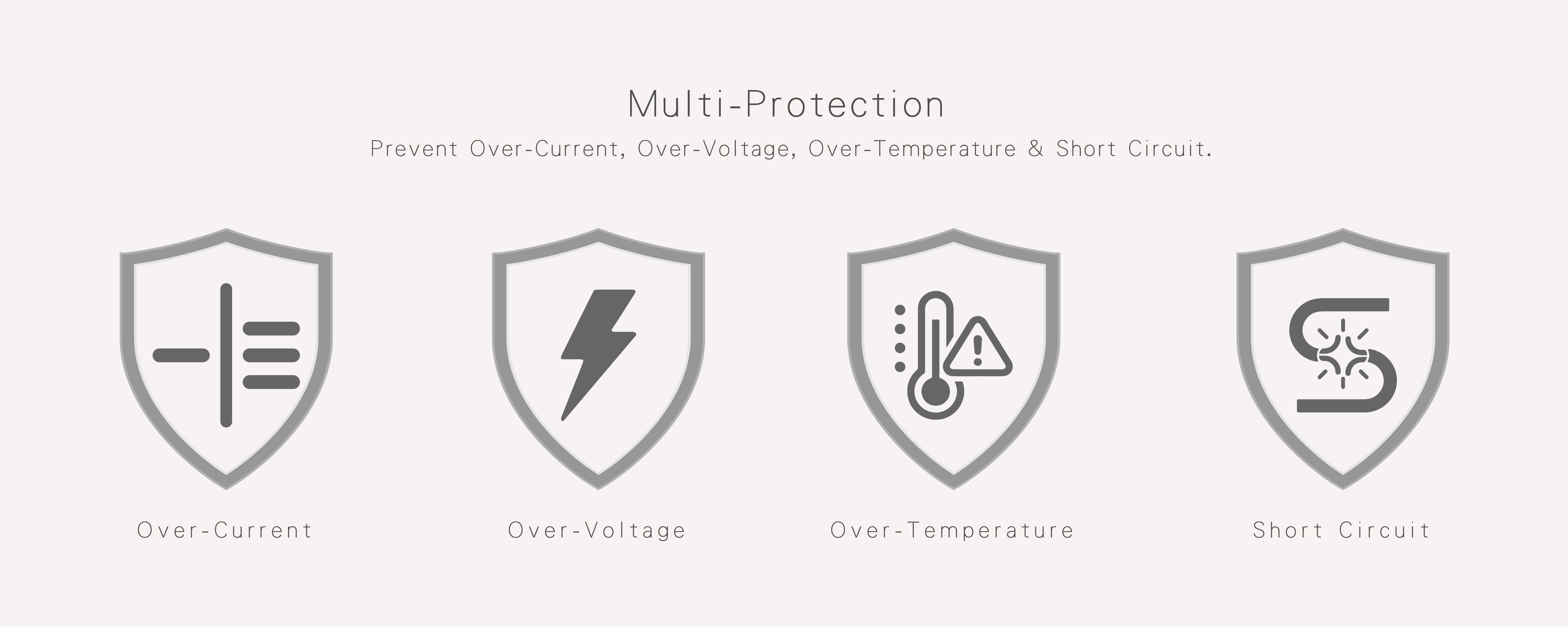 - Multiple safety protection, prevent Over-Current, Over-Voltage, Over-Temperature and