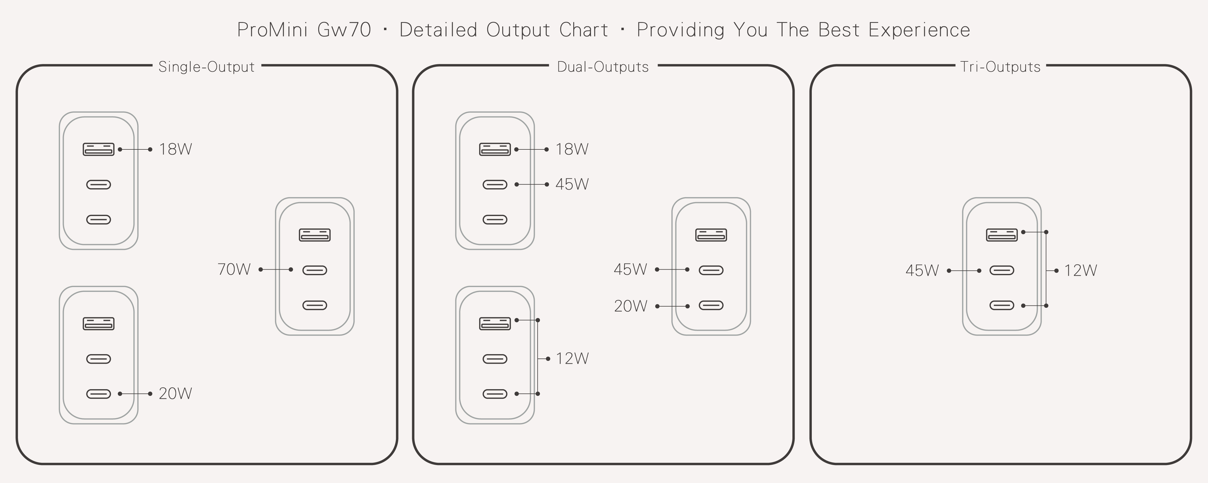 - Tri-output - USB-C1 70W, USB-C2 20W, USB-A 18W individually.
