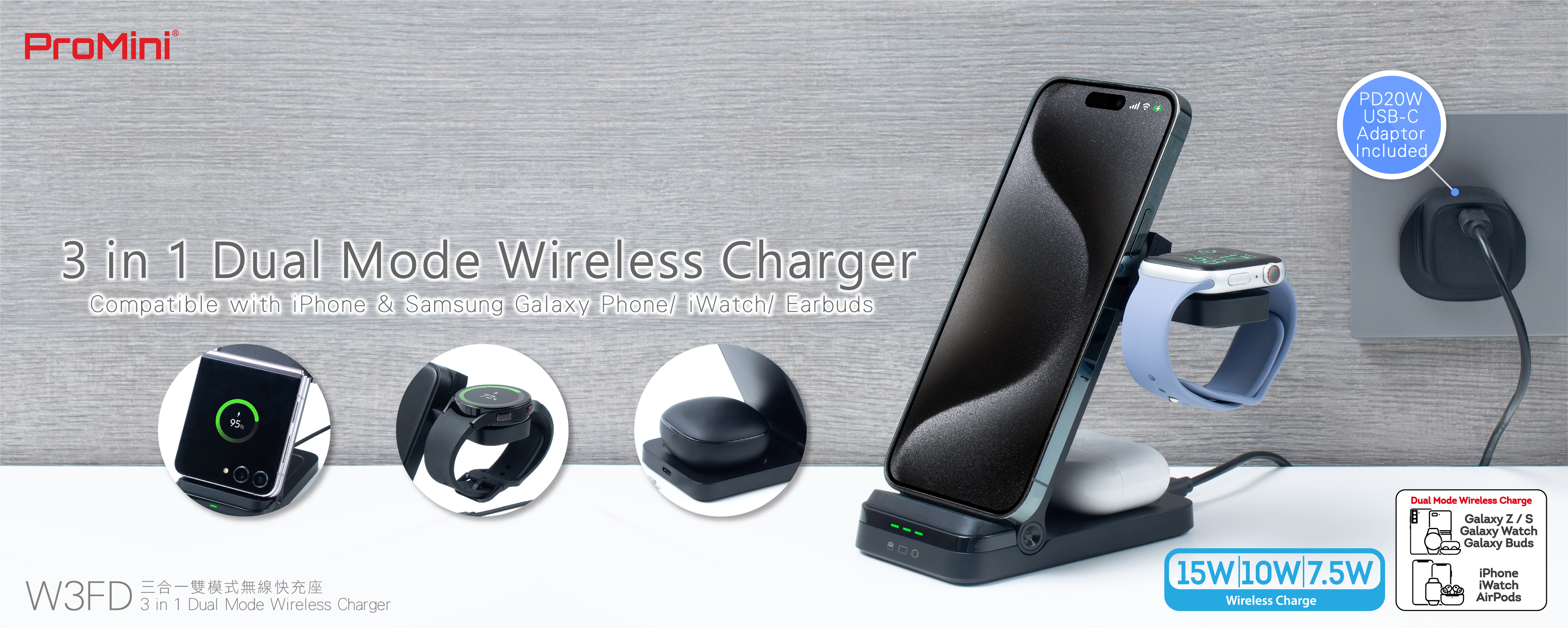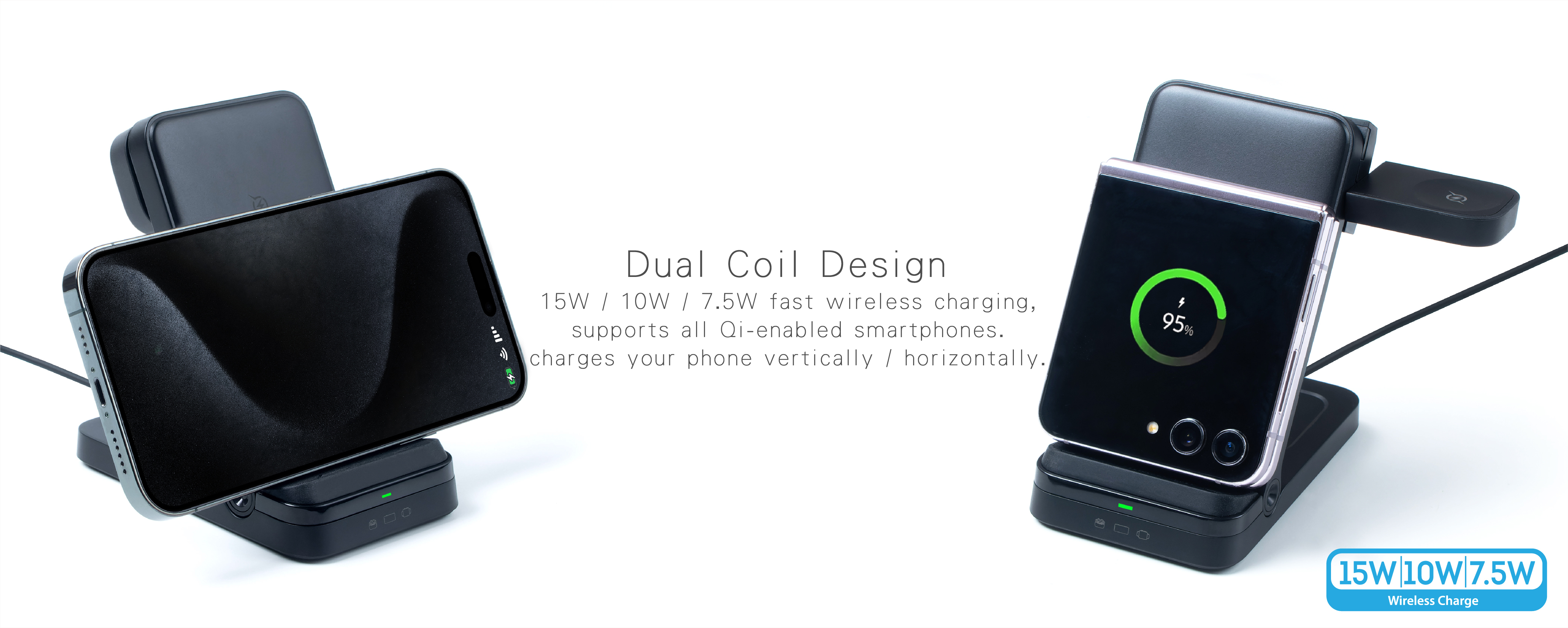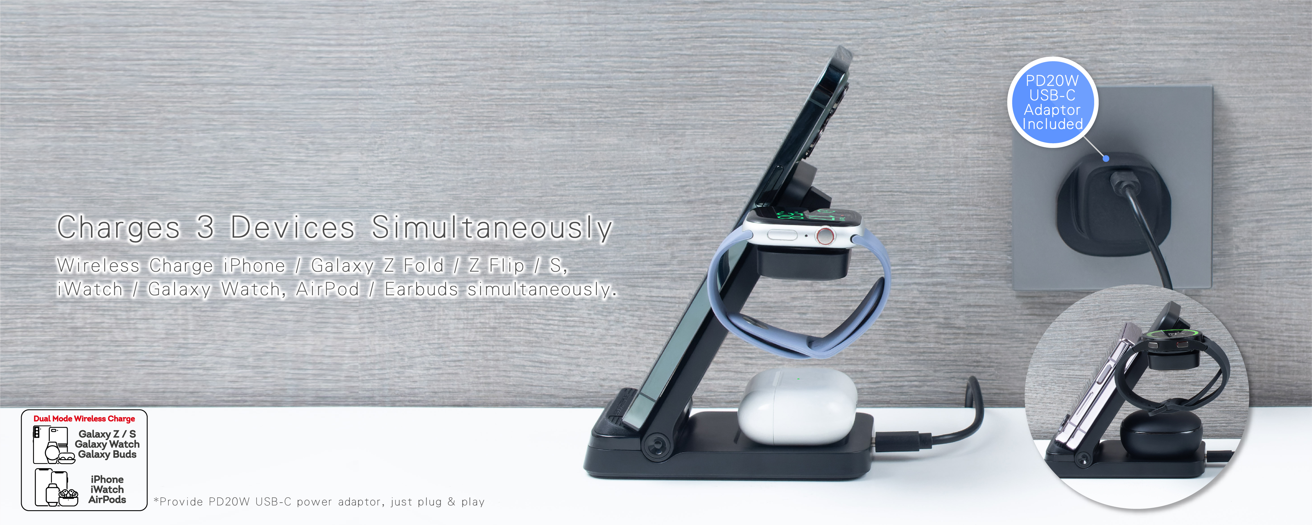 Dual Mode: Wireless Charge iPhone/Galaxy Z Fold/Z Flip/S, iWatch/Galaxy Watch, AirPod/Earbuds simultaneously.