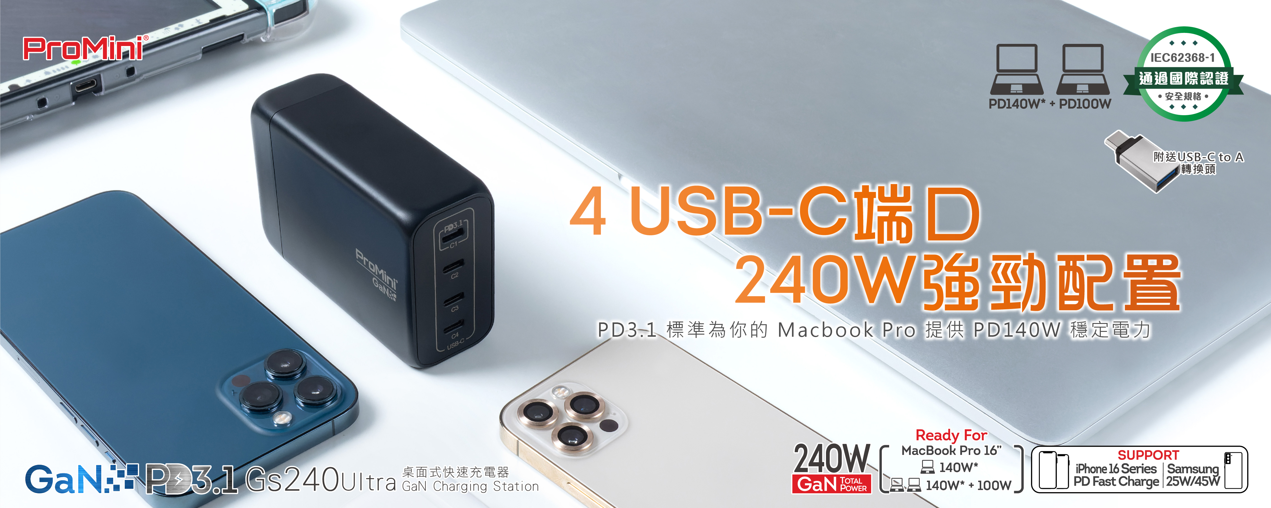 - 4x USB-C PD3.1 GaN 240W桌面式快速充電器