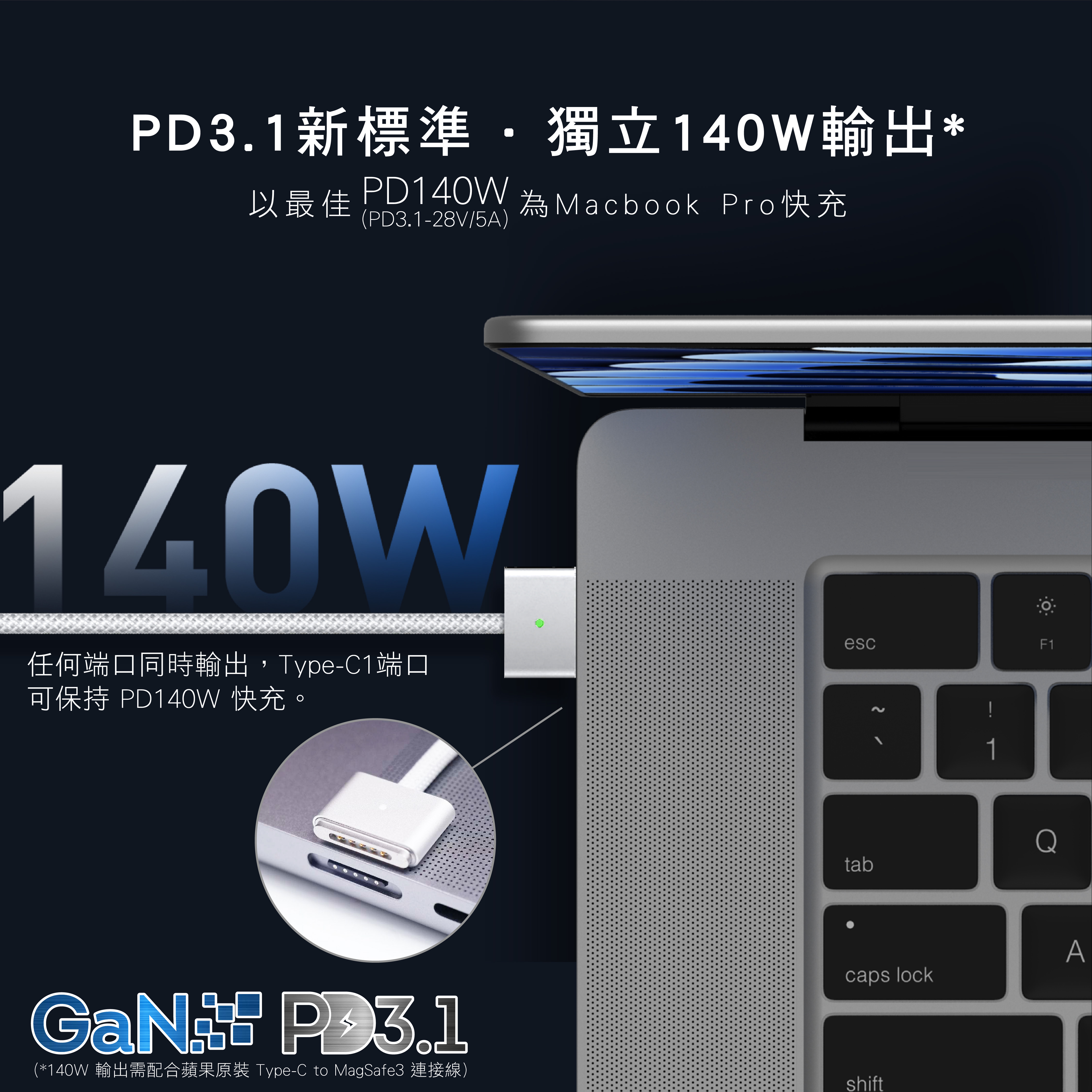 -為3台 MacBook Pro / 筆記本電腦充電提供全速PD140W+PD140W+PD100W (Max.)快速充電