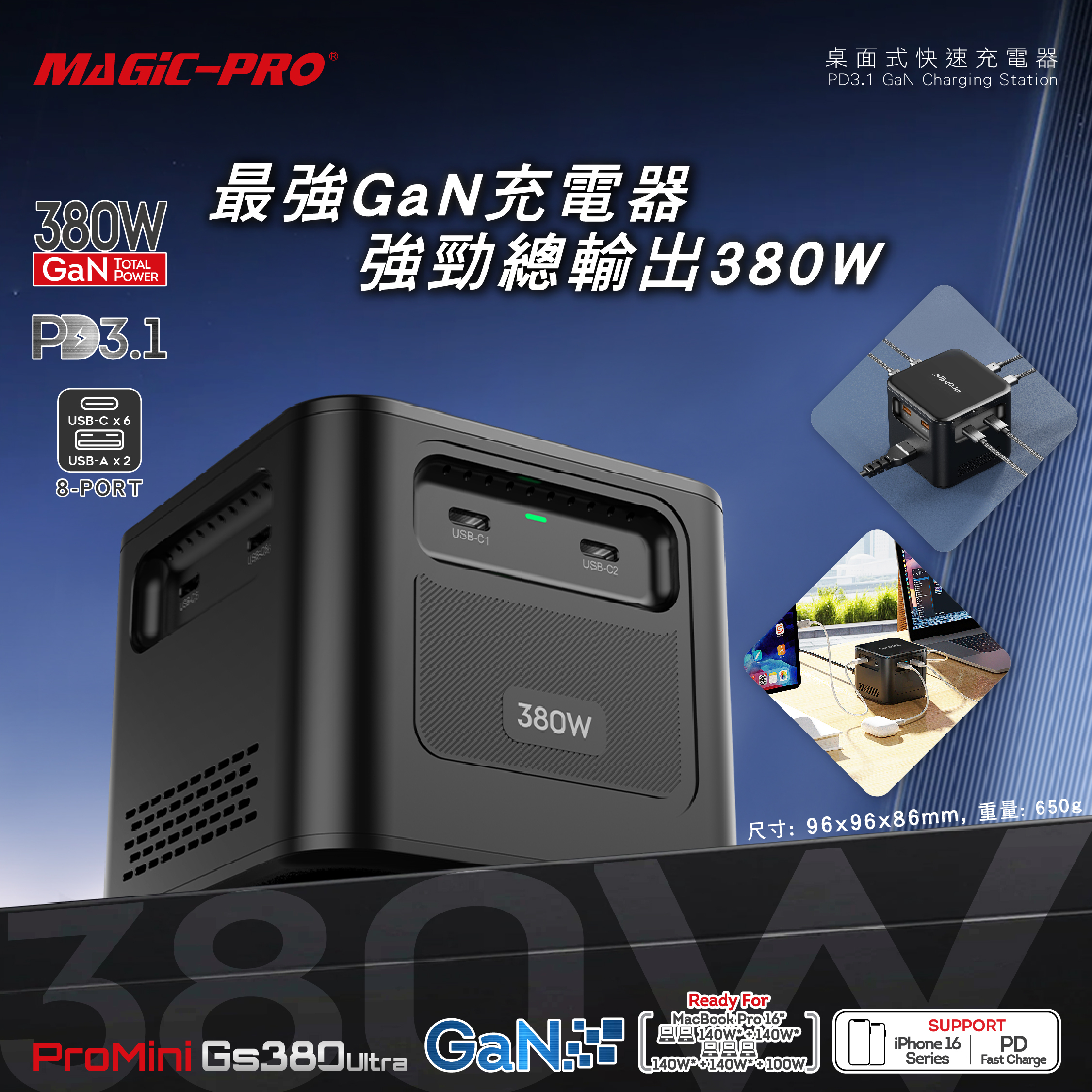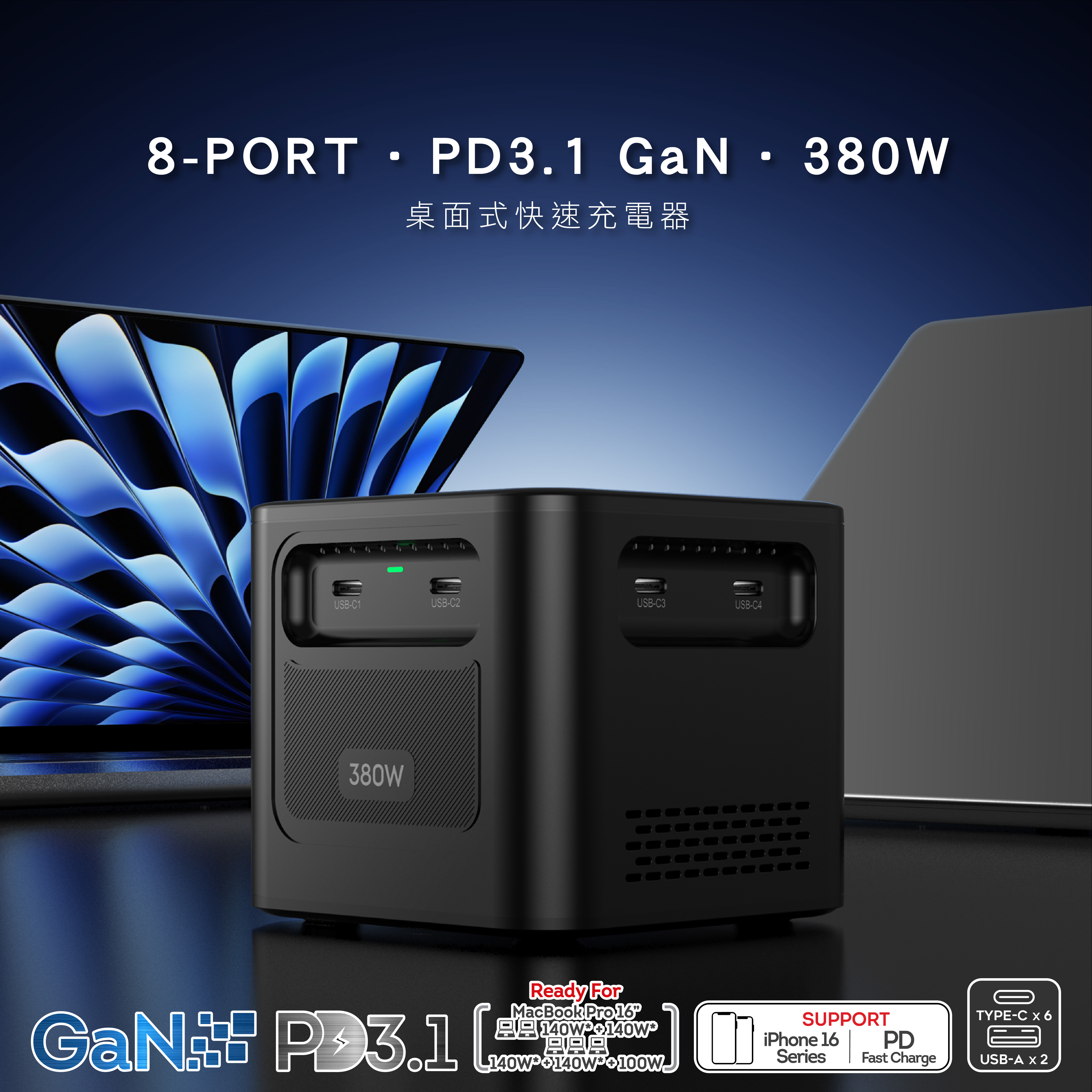 -8-Port PD3.1.GaN 380W桌面式快速充電器