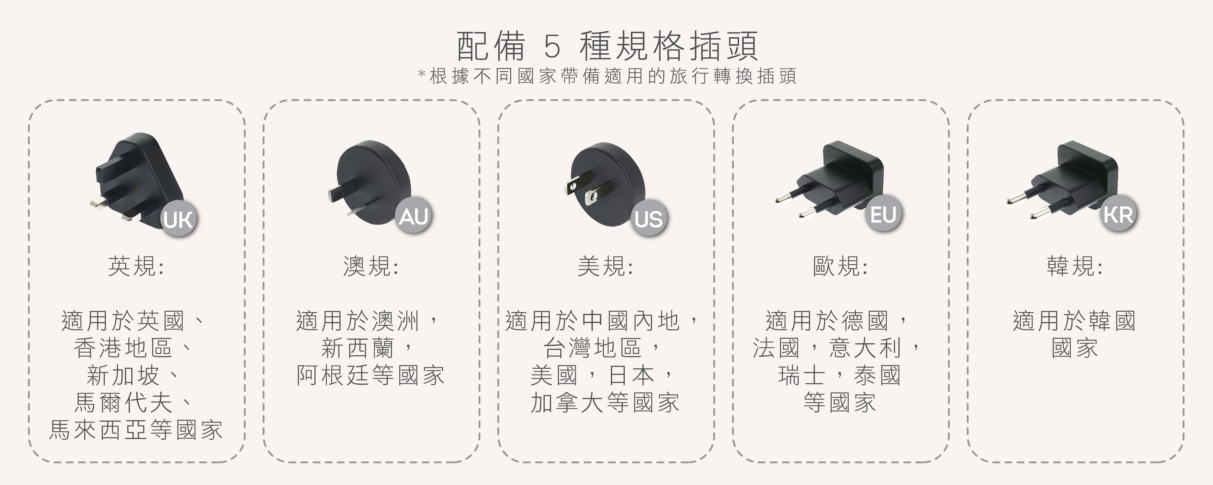 - AC轉換插頭 (UK, AU, EU, US, KR)