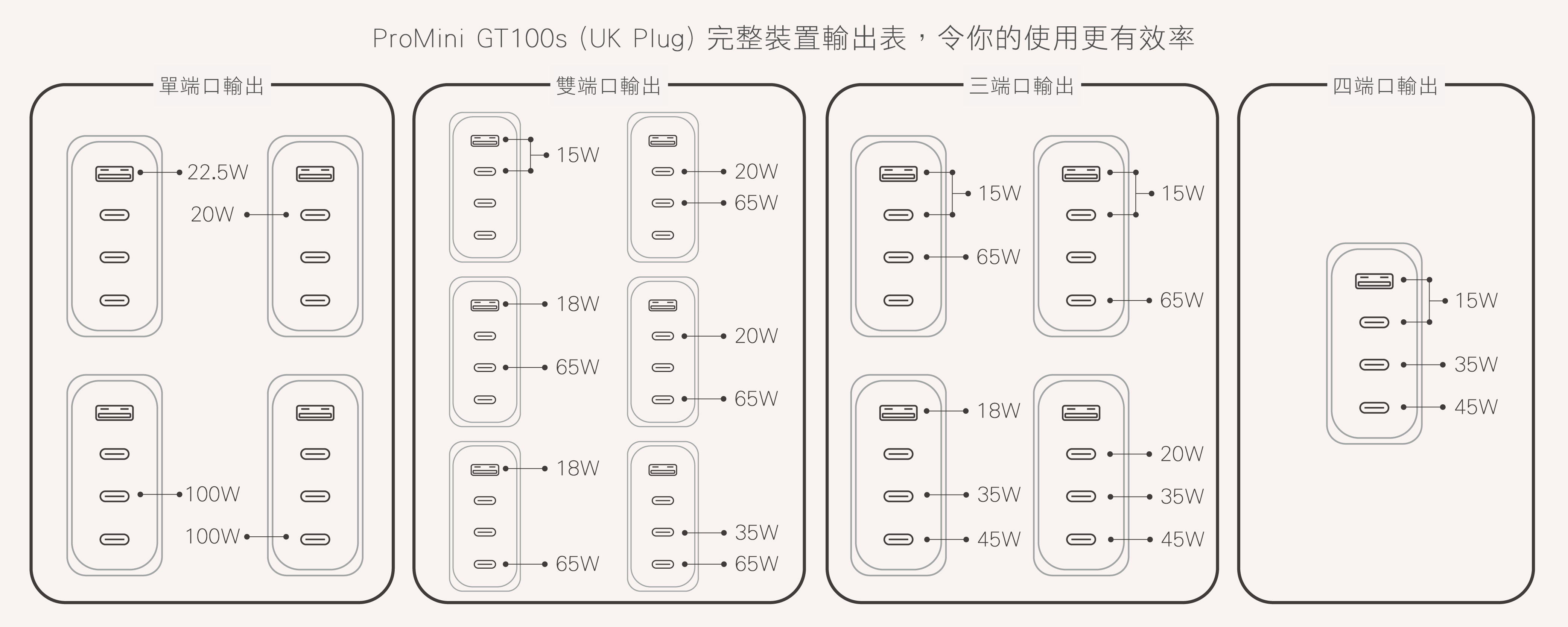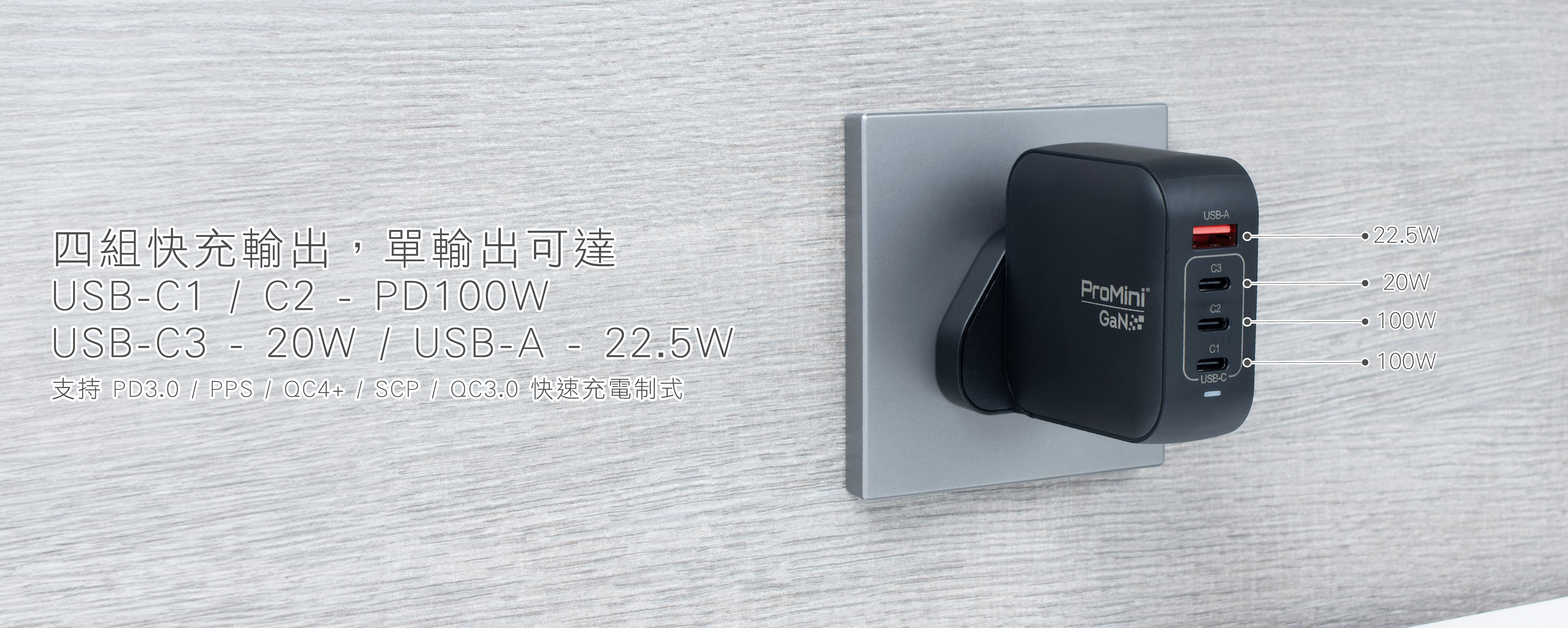 - 四組輸出端口,單輸出可達- C1-PD100W,C2-PD100W,C3-PD20W,USB-A 22.5W