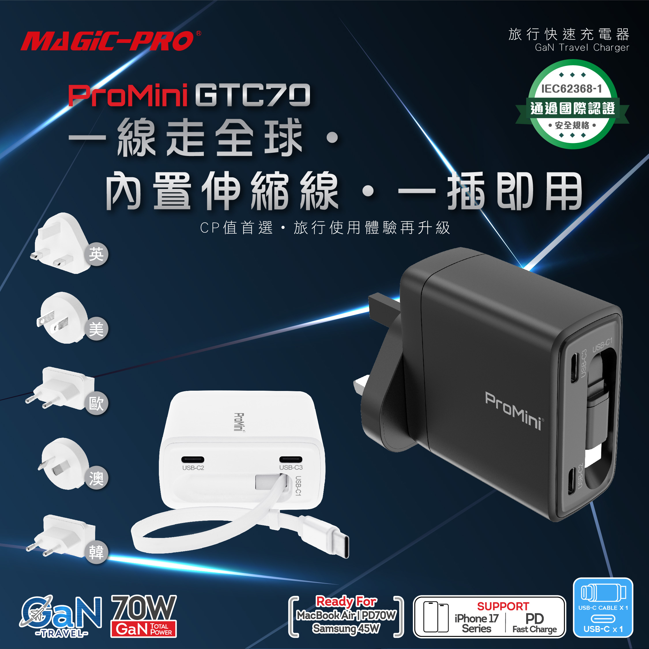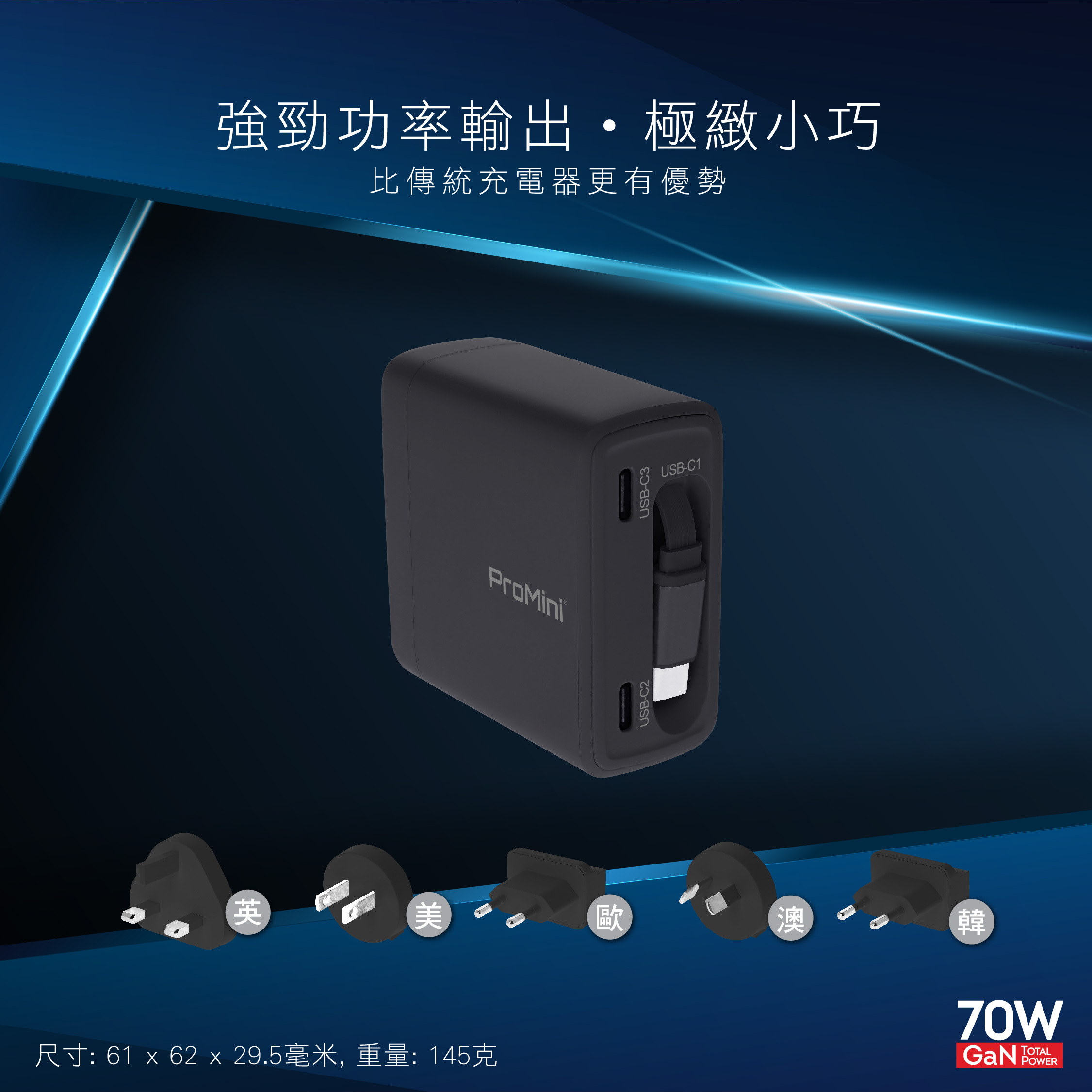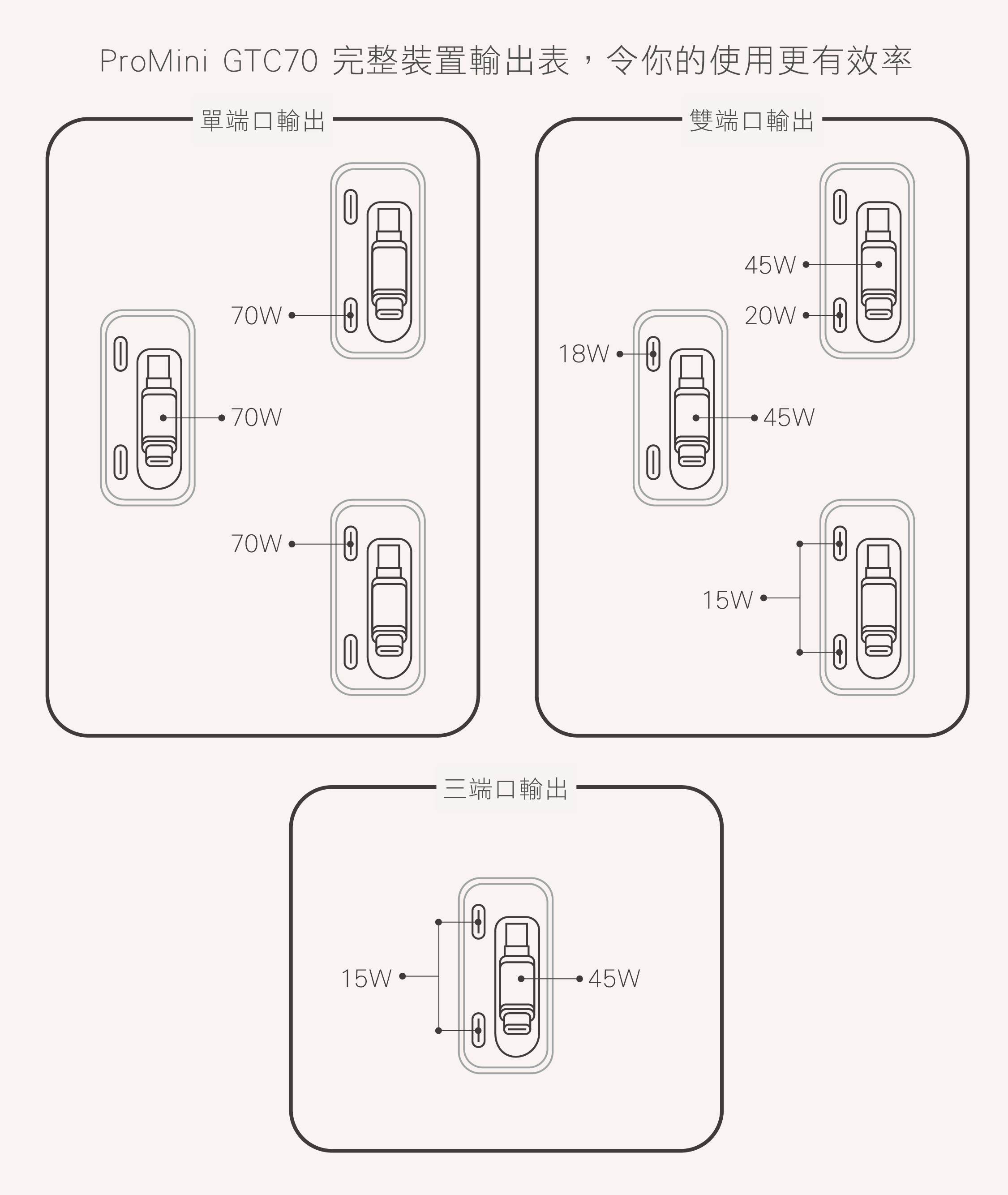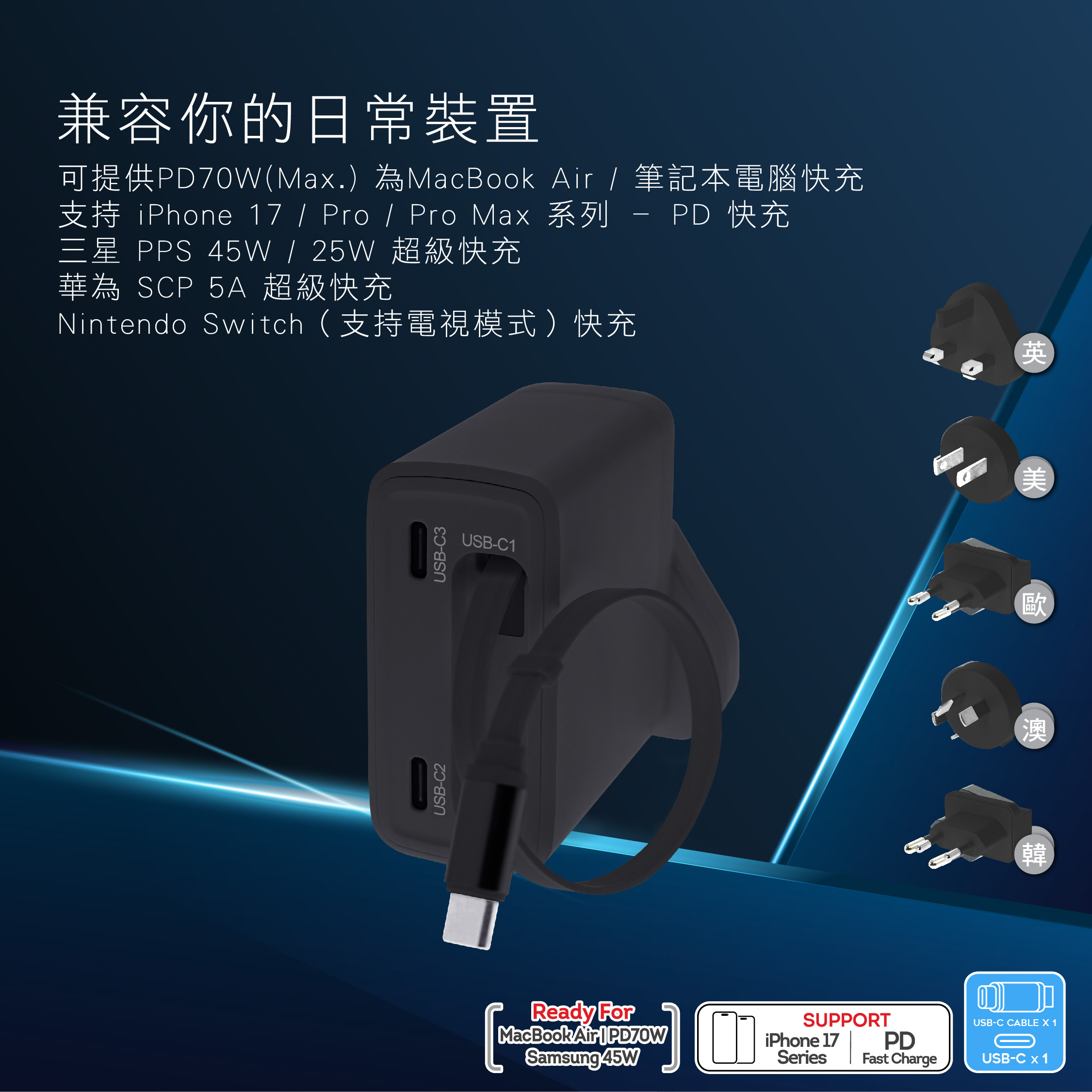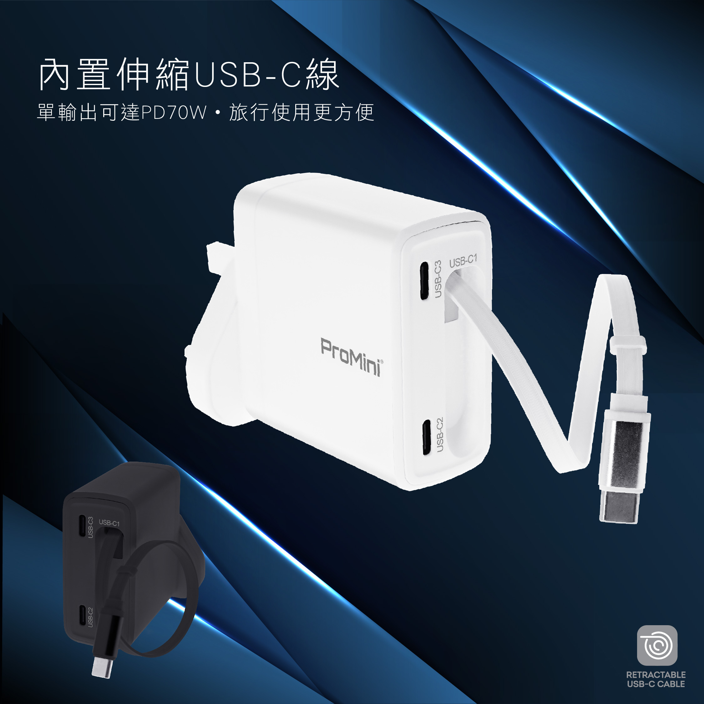 三輸出, 內置伸縮USB-C線- 單輸出C1線-70W,C2-70W,C3-70W