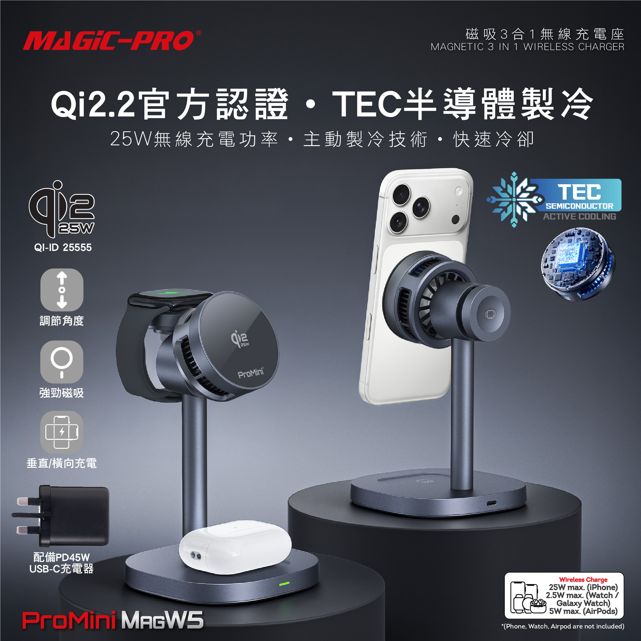 - 32.5W Qi2.2 認證•TEC半導體製冷三合一無線充電座連火牛