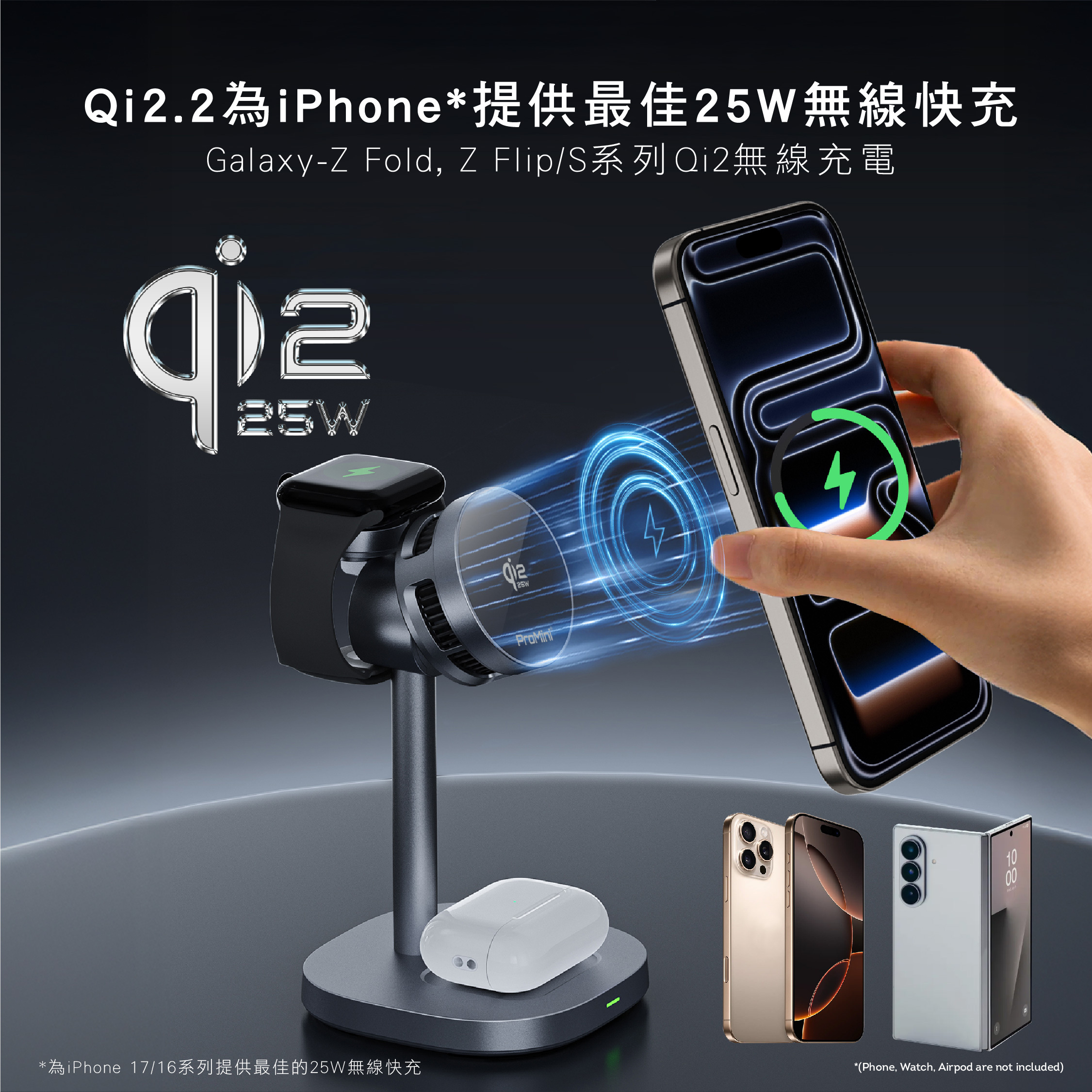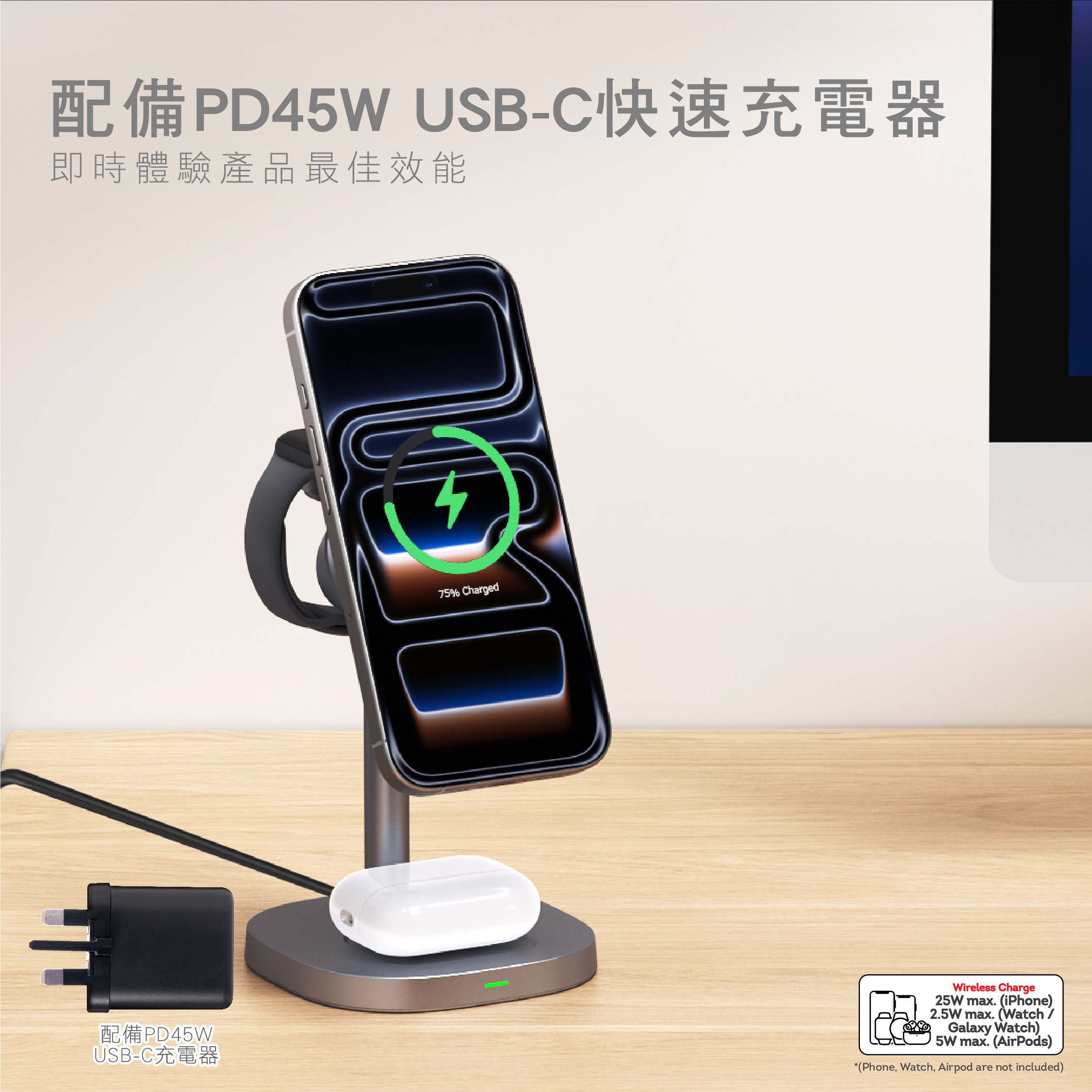 -可同時為 iPhone/Galaxy Z Fold/Z Flip/S、iWatch/Galaxy Watch、AirPods/Earbuds 進行無線充電