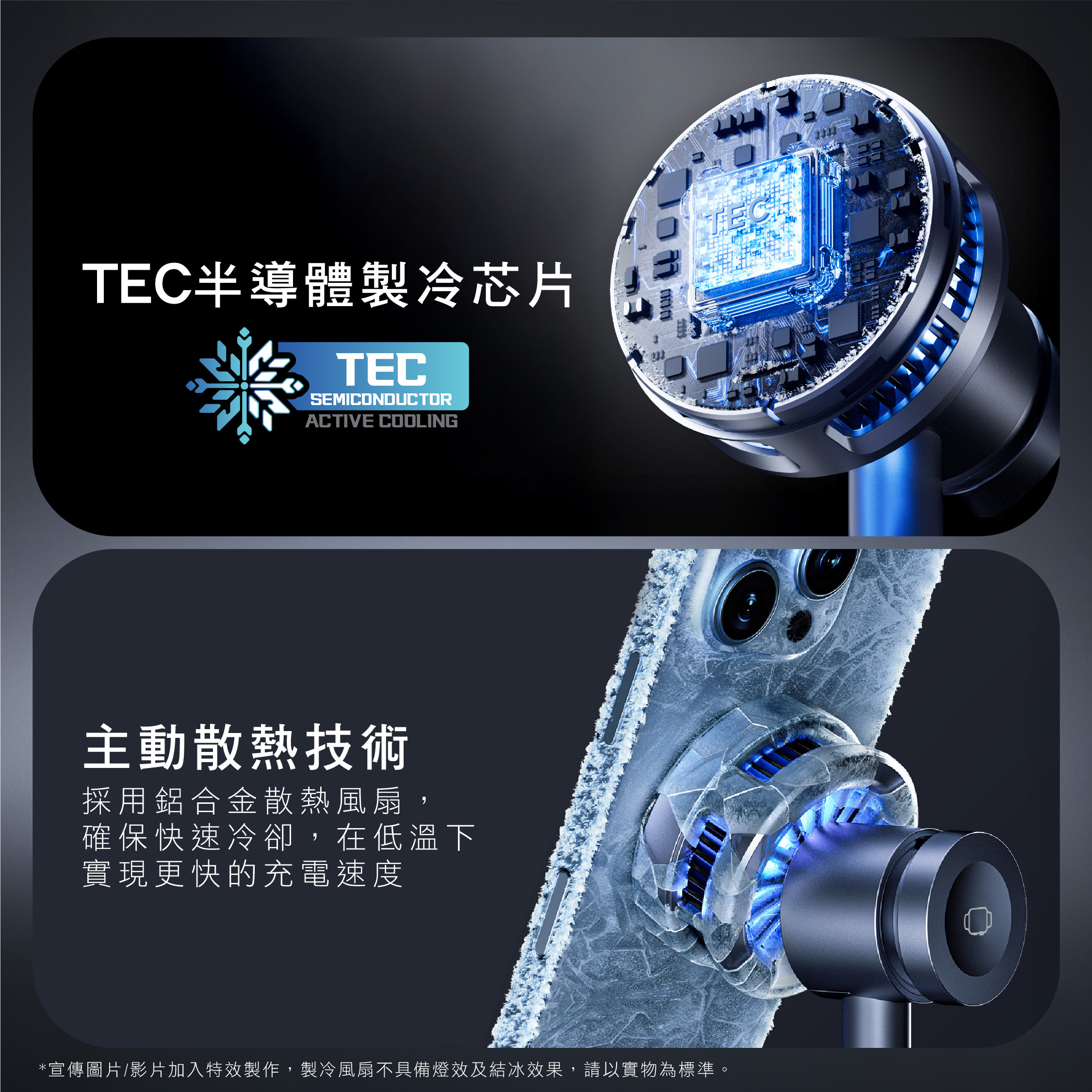 - TEC Semiconductor(半導體製冷)主動散熱技術,採用鋁合金散熱風扇,確保快速冷卻,在低溫下實現更快的充電速度