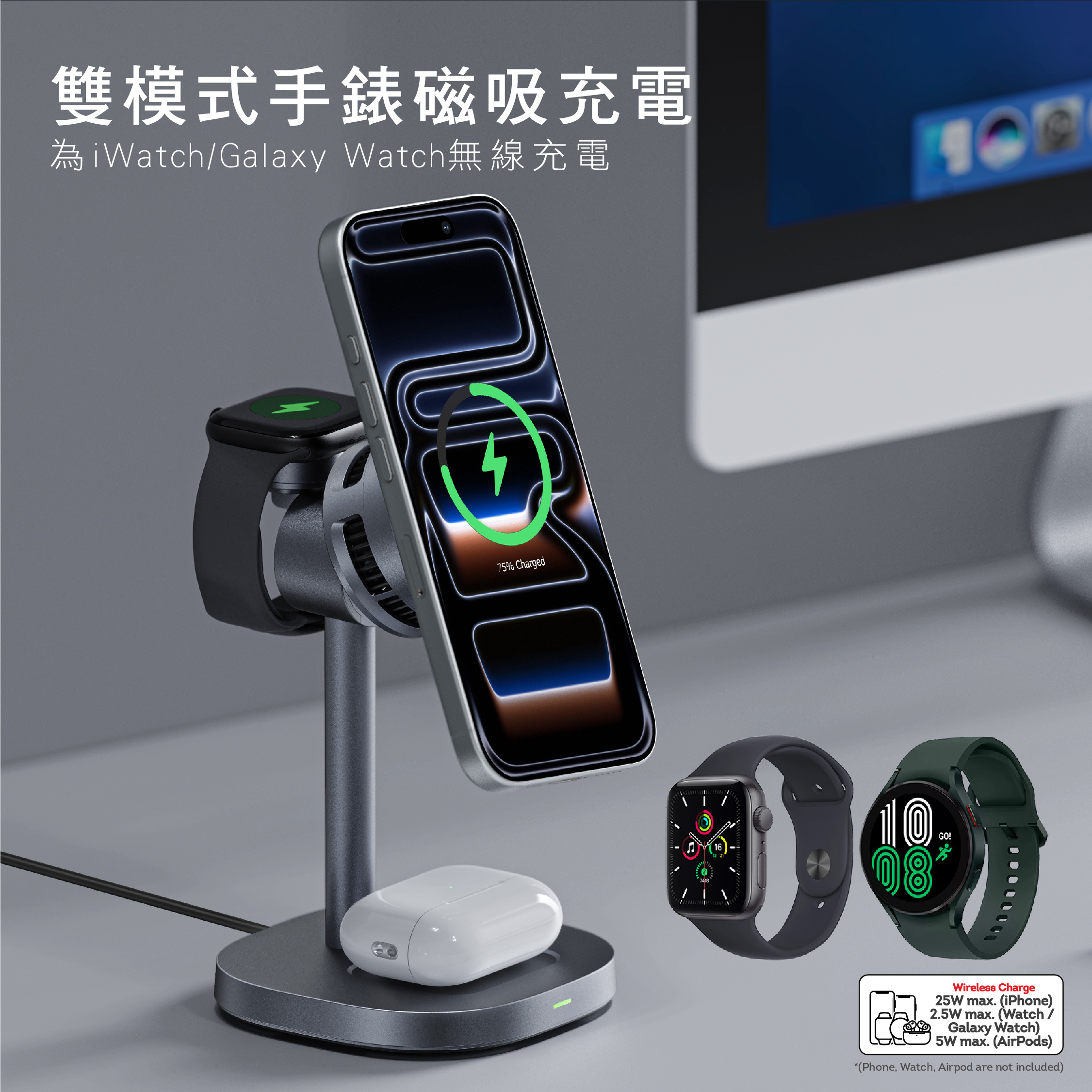 - 雙模式iWatch/Galaxy Watch磁吸充電座