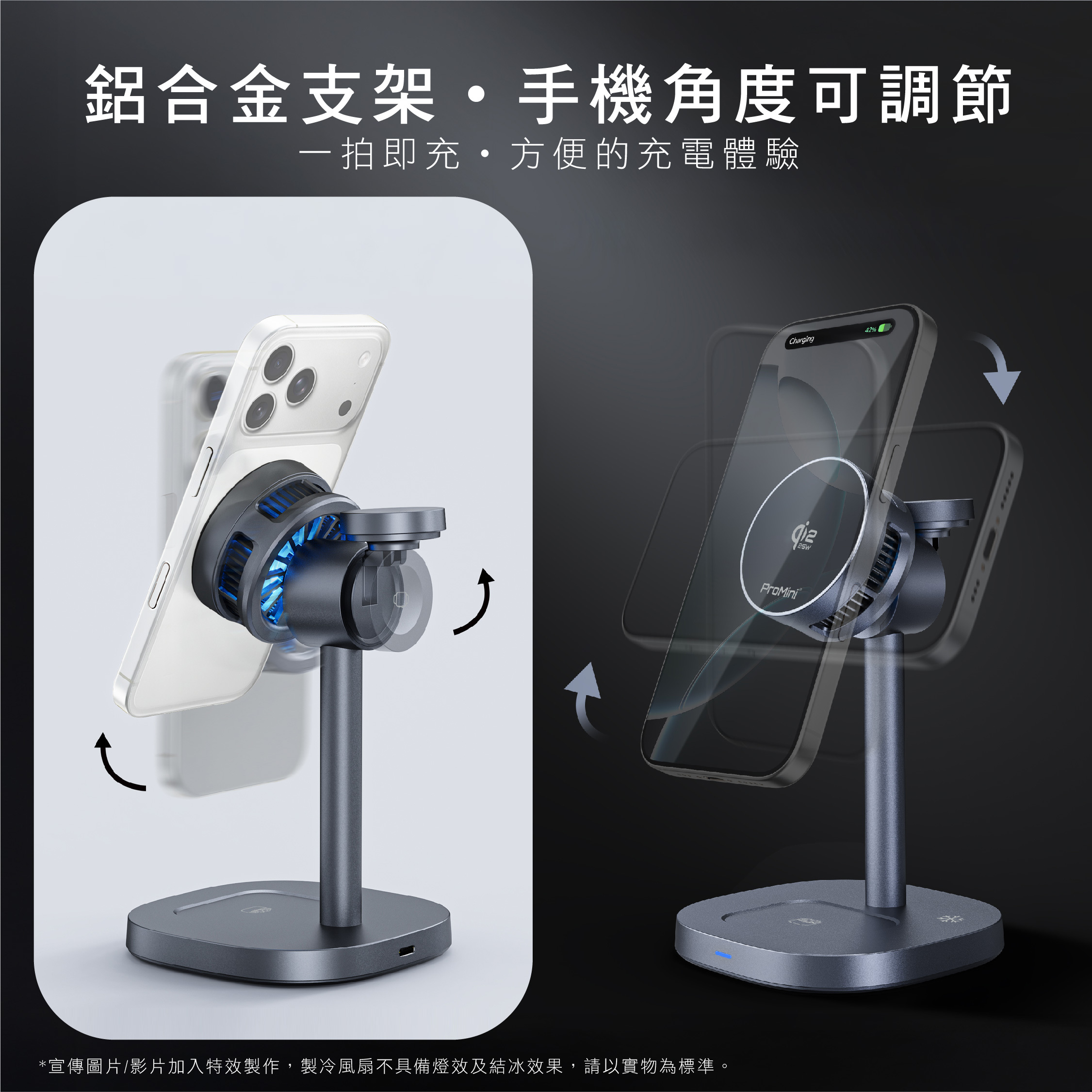 - 鋁合金支架,手機角度可調節,方便的充電體驗