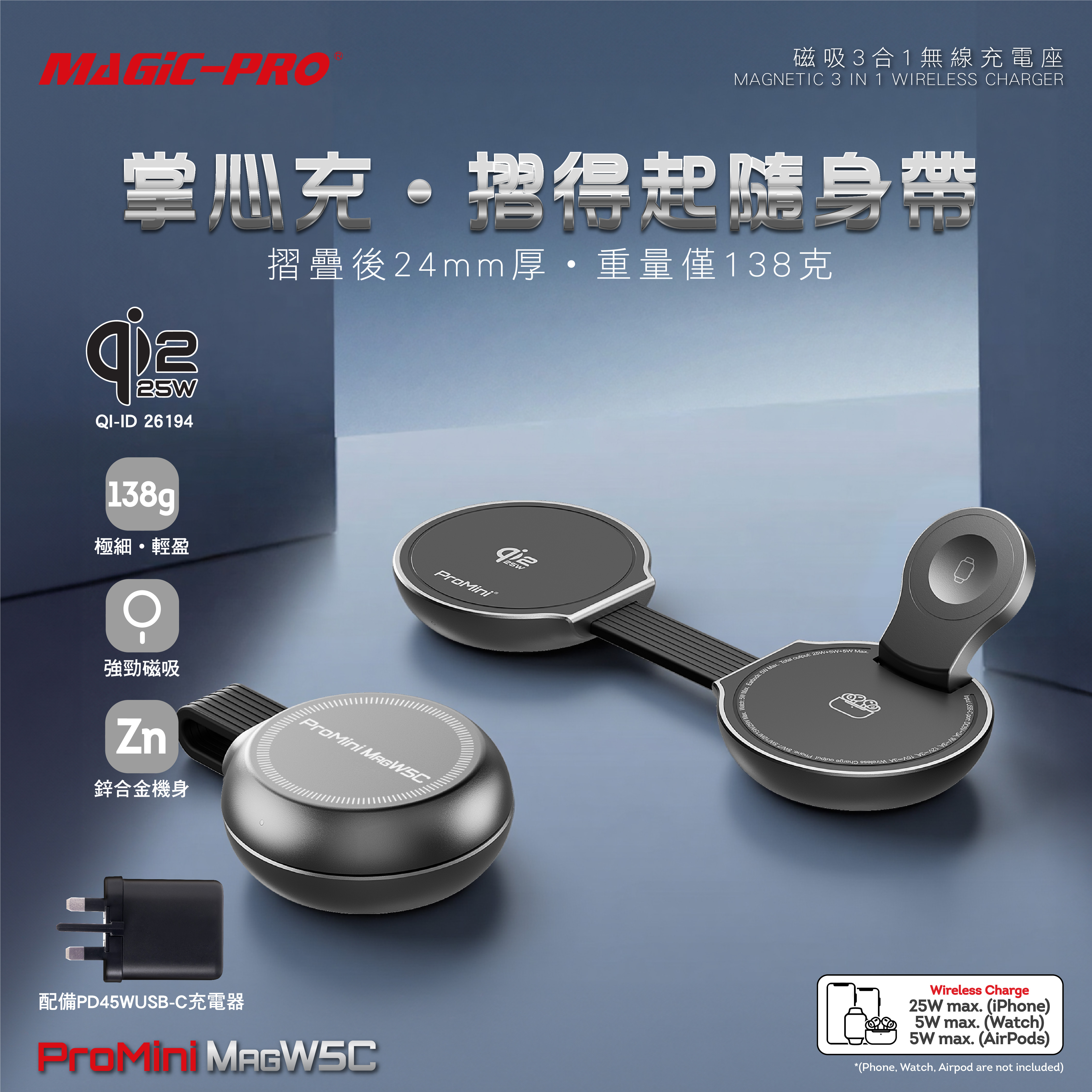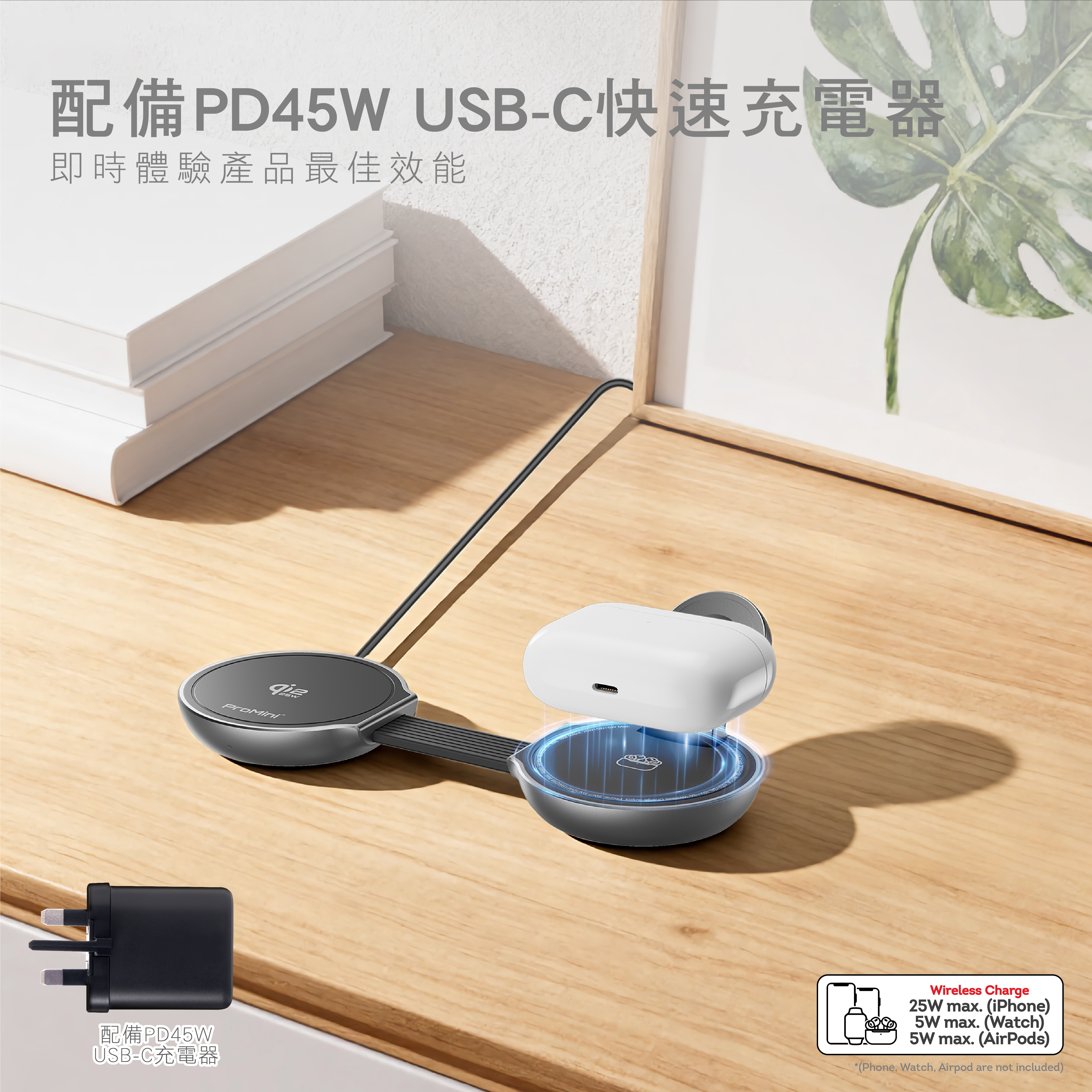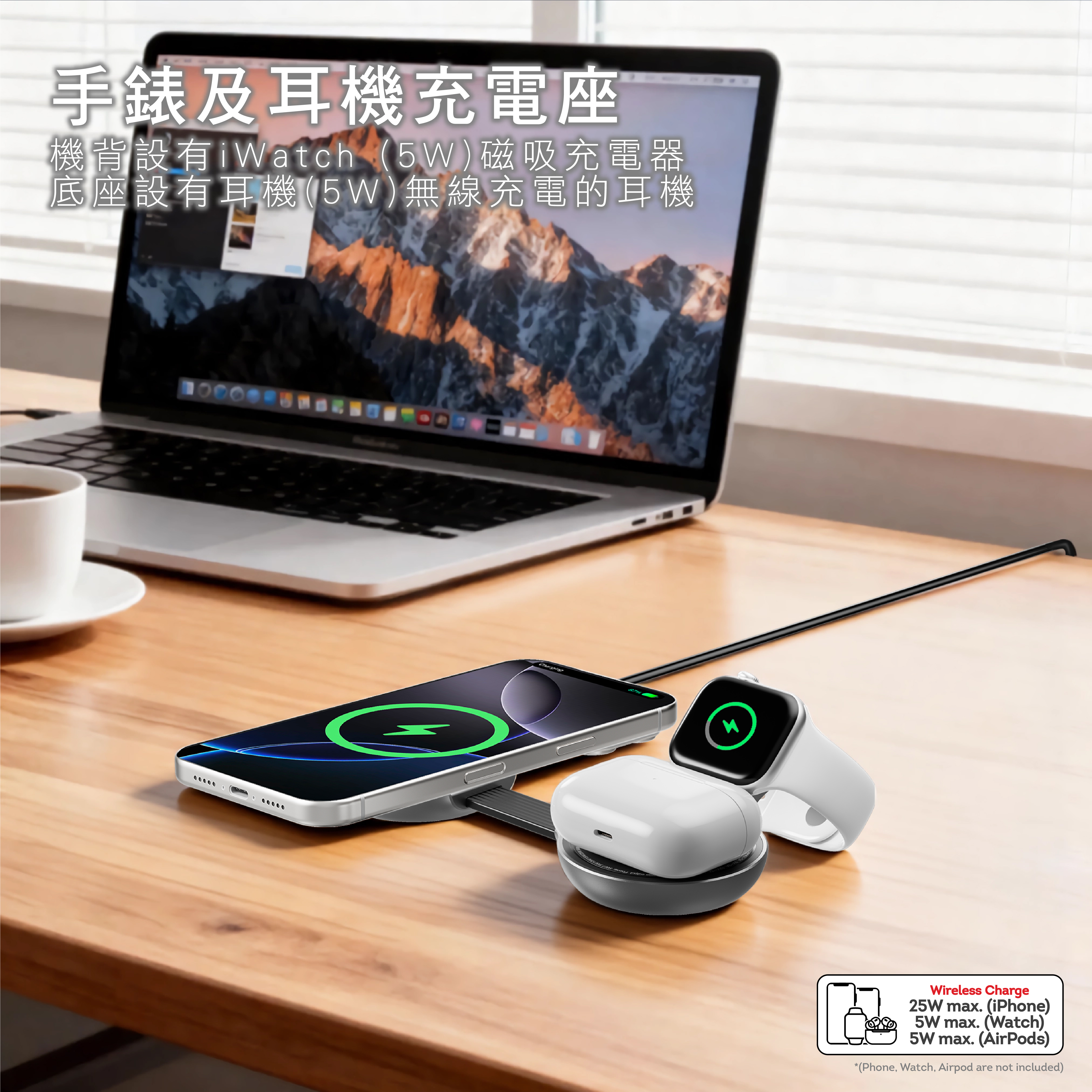 - 提供iPhone(25W Max.),Watch (5W Max.),AirPods (5W Max.)無線快充