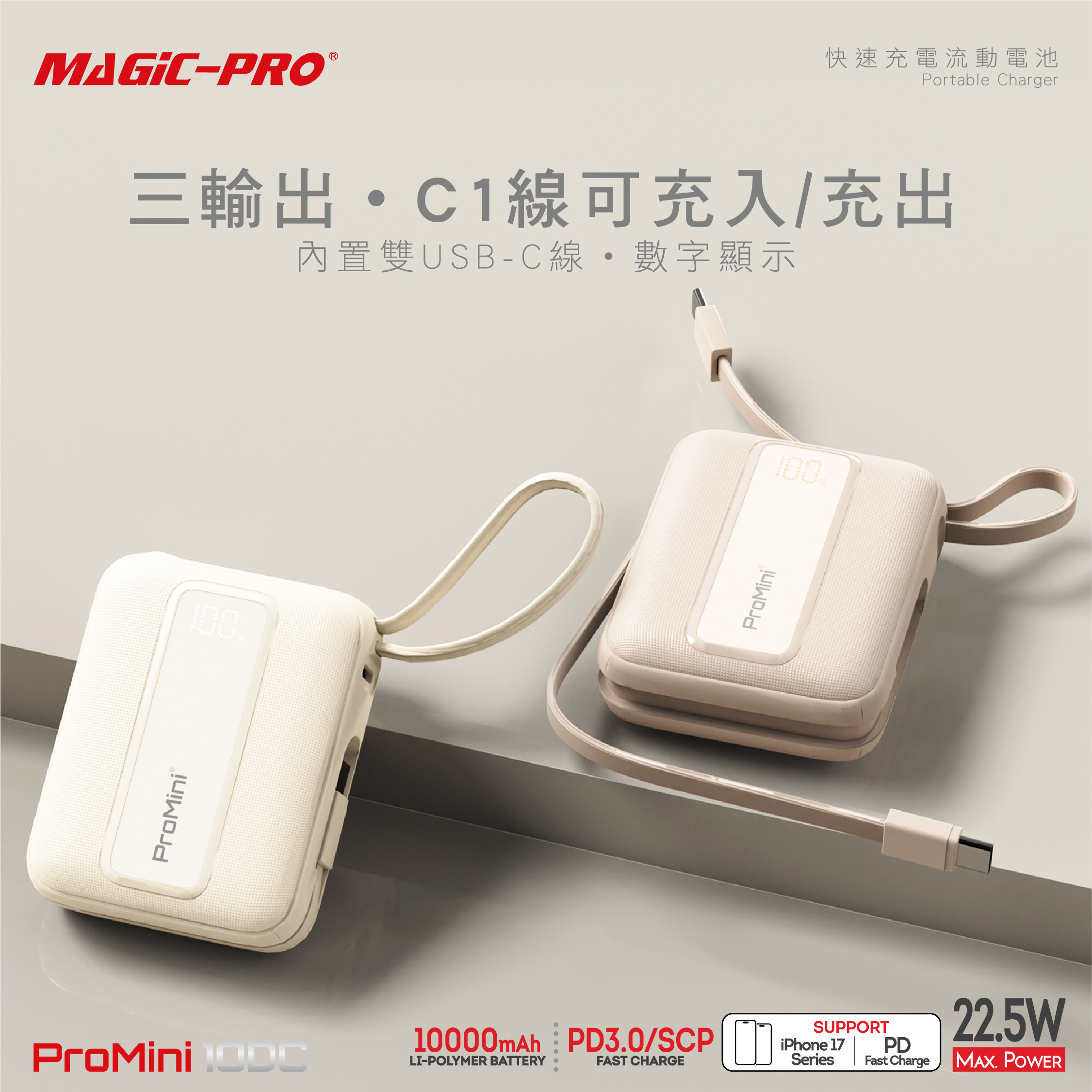 - 內置2x USB-C線, 數字顯示